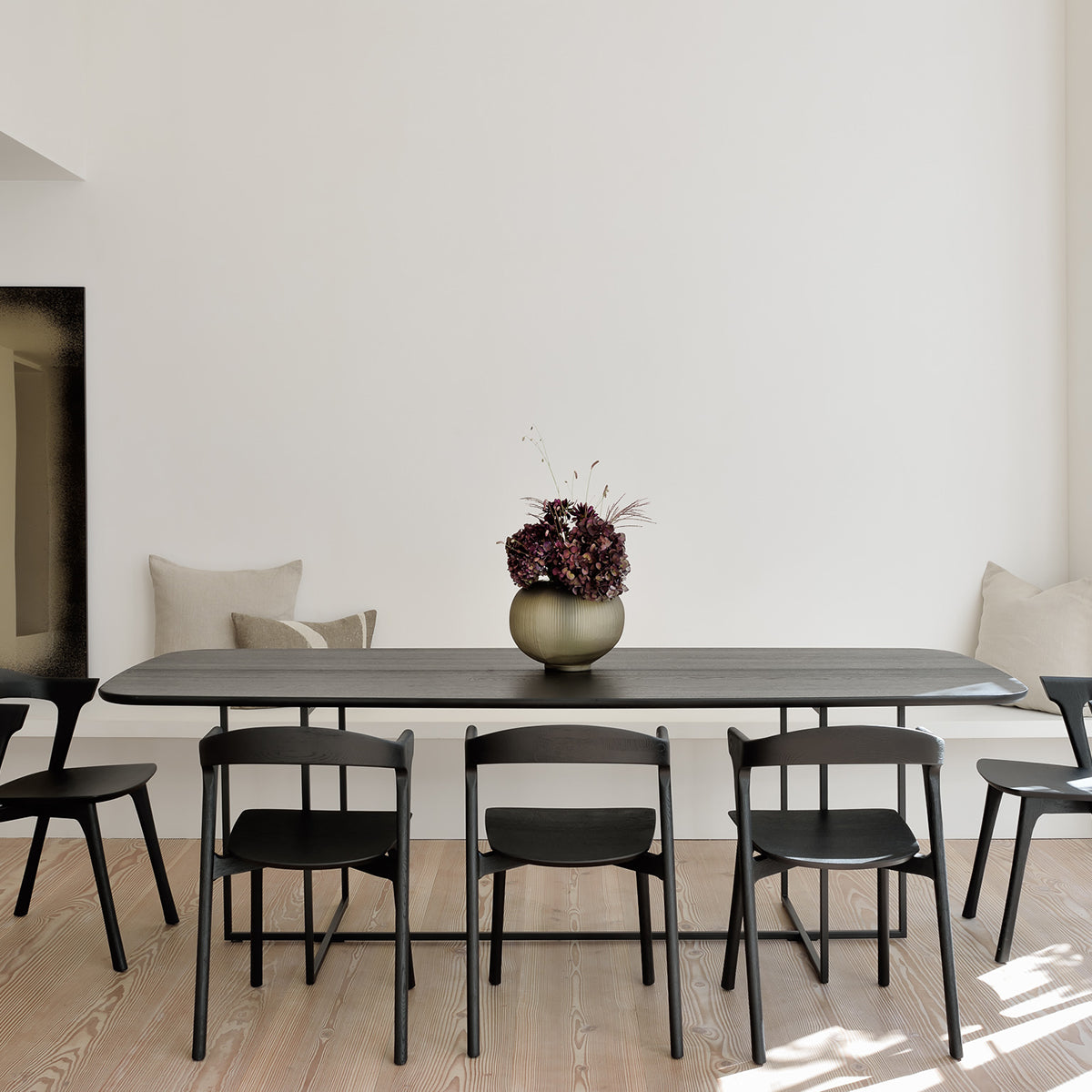 Come together for work or pleasure with the Oak Arc dining table. Combining a tapered black metal leg base against a brushed black Oak finish, the Arc's design is a refined form featuring a unique light ambiance and a slightly rounded tabletop. A contemporary masterpiece by Alain Van Havre.