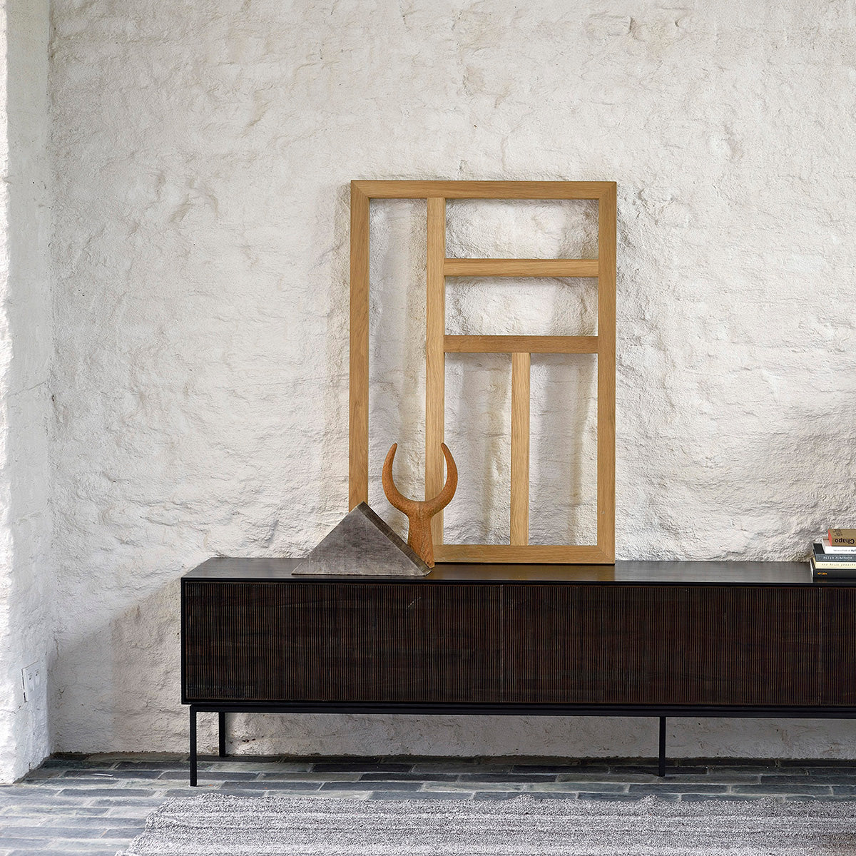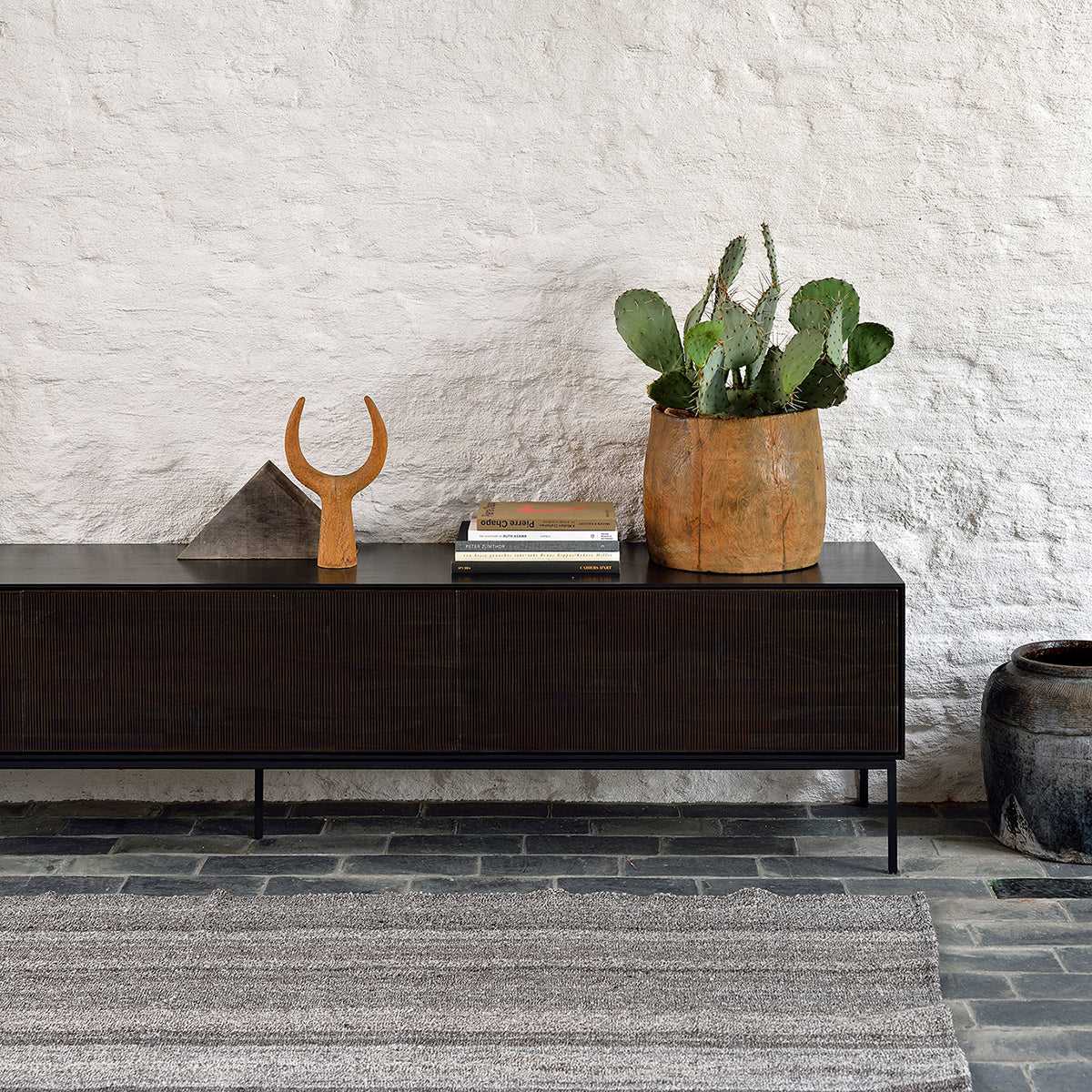 The Grooves TV cupboard in solid teak is soulful to say the least. Every single line you see is hand carved, making each piece truly unique. Small imperfections are part of the story, even more so: they enhance Grooves' character. The result is a slightly different surface every time, each with its own rhythm and dynamics. The beautiful dark-tinted teak continues on the inside, where shelves and drawers will hold your most cherished objects.