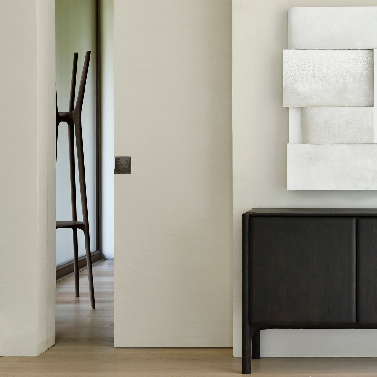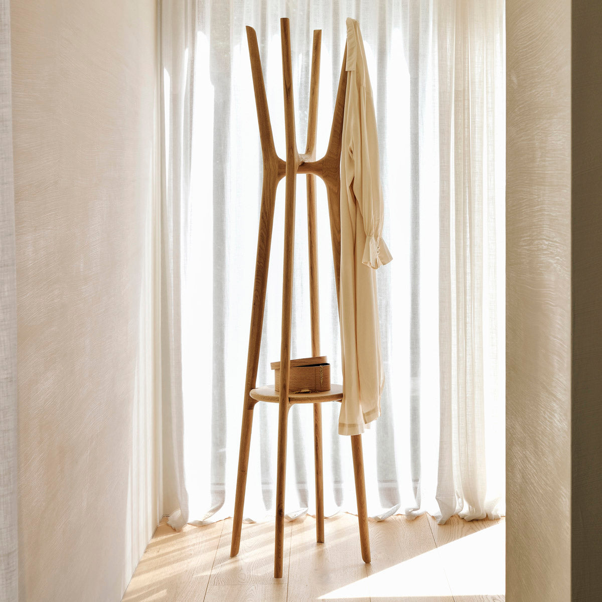 The Pi Coat Stand combines minimalist design with functional elegance. Crafted from solid wood, its sculptural form features slender legs that interlock to provide a sturdy structure, perfect for hanging coats, hats, and bags. The natural finish enhances its organic appeal, making it a stylish addition to any entryway or bedroom. Its tall, graceful silhouette not only serves a practical purpose but also elevates the aesthetic of modern interiors with its understated sophistication.