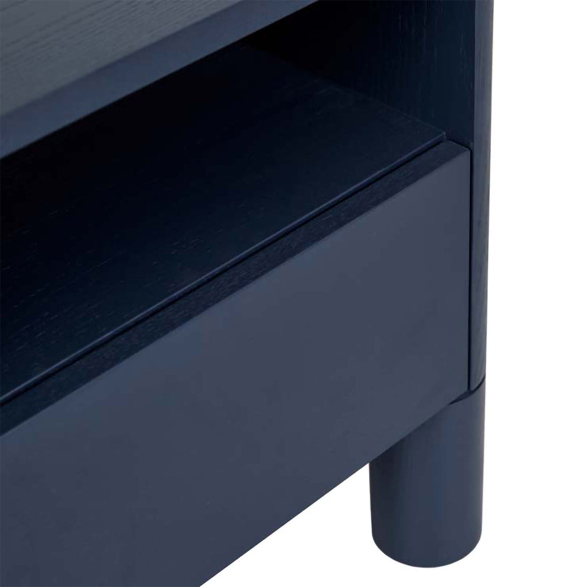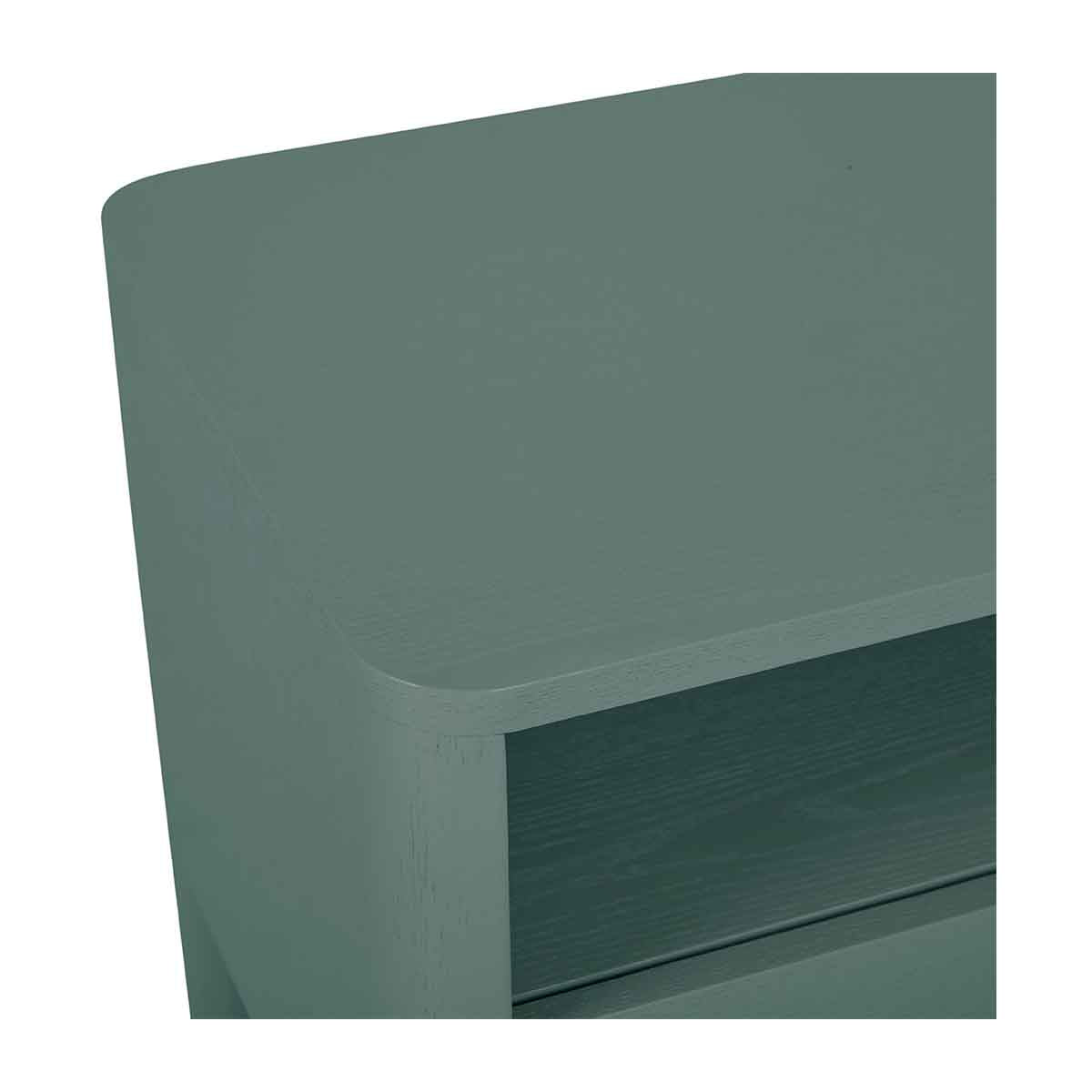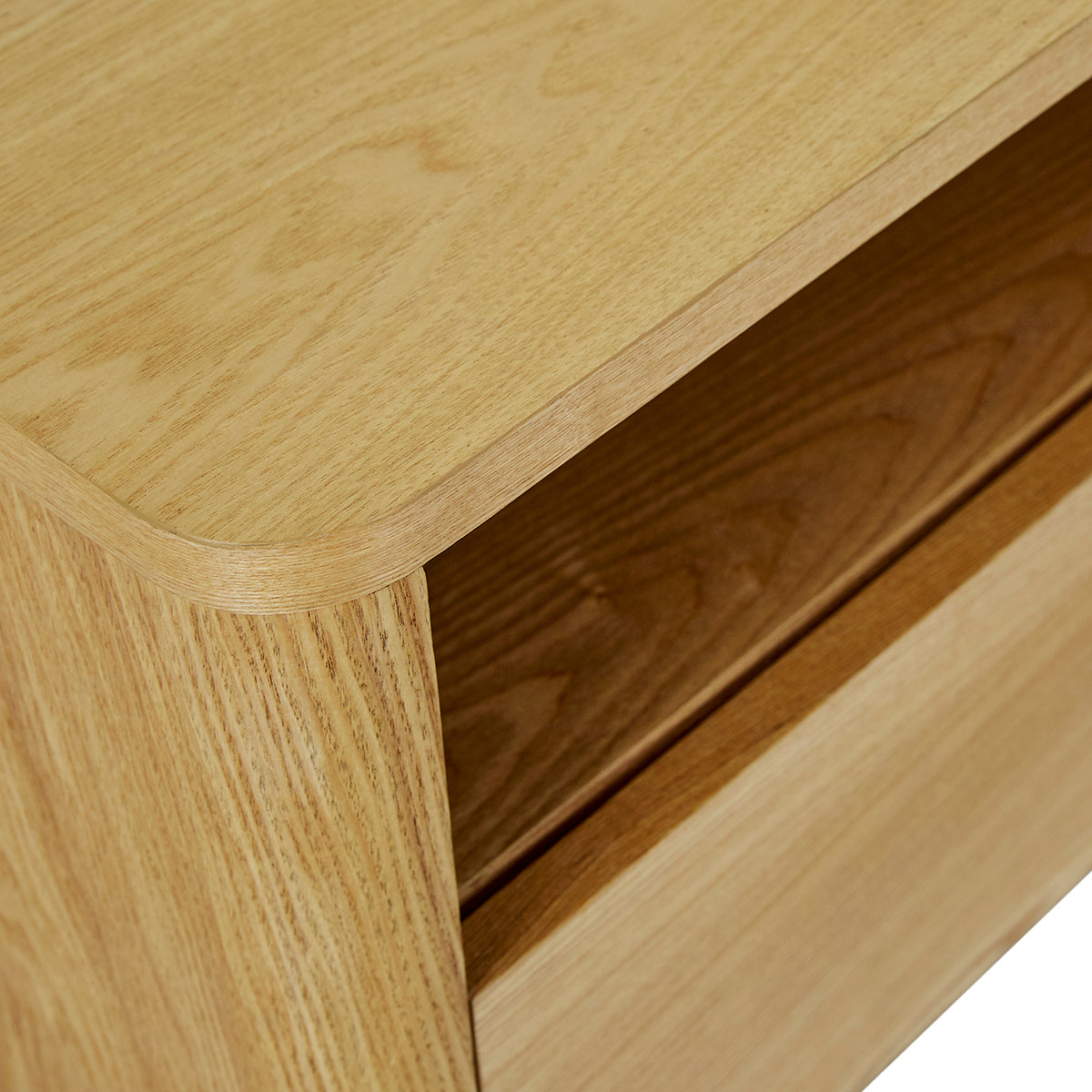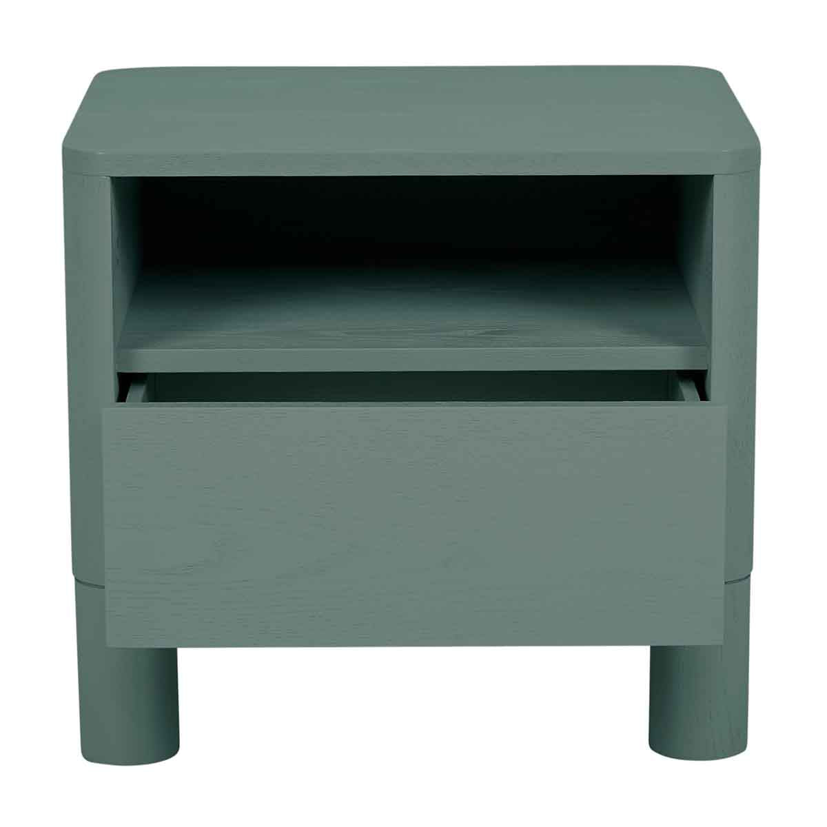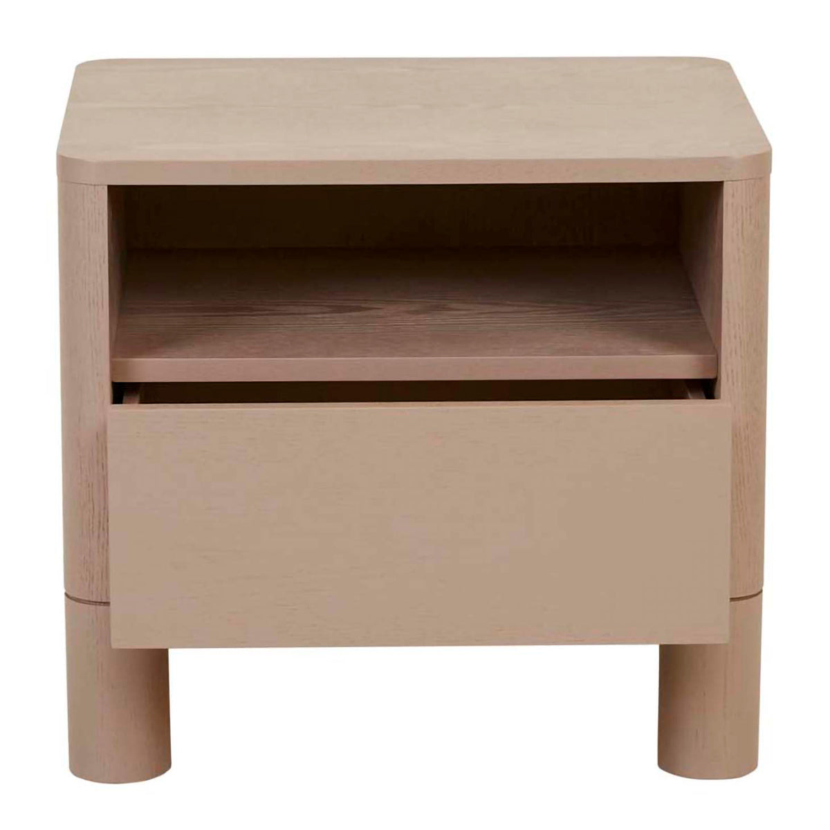 Supported by rounded pillar legs for bold style, the Artie Open bedside is designed in durable timber veneer. It has a drawer for storage and an open shelf to further the modern look.