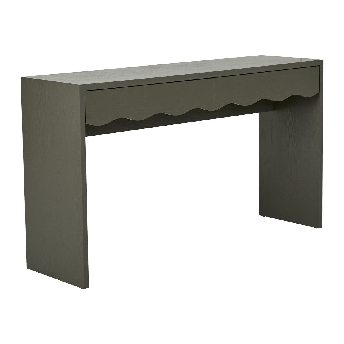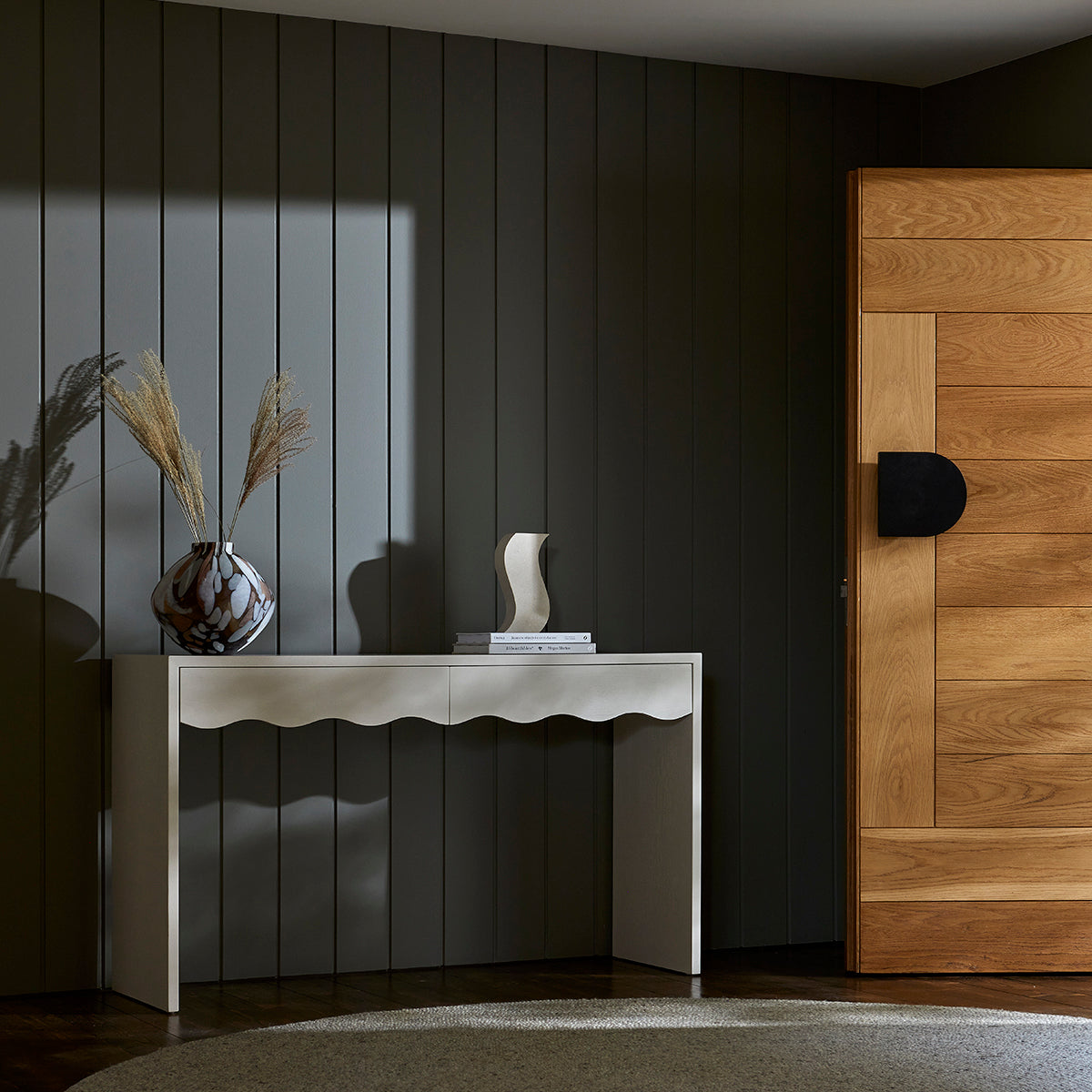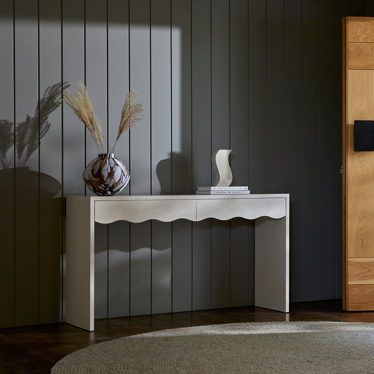 The Artie Wave Console showcases the fusion of modern minimalism with a touch of elegance ideal for any entryway or living space. Understated with a graceful wave accented front this console table delivers display and storage space, along with a fun sense of personality to enliven a space. Its two drawers offer the perfect place to store the essentials, perfect to keep the top clear so you can style it with your favourite decorative objects.