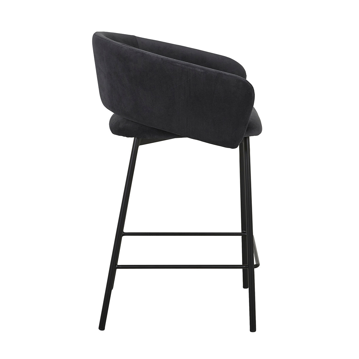 The Asher Velvet Bar Stool is a contemporary piece that features an appealing mix of clean lines and sleek curves. The cushioned bucket seat and low backrest are wrapped in a luxurious black velvet fabric white tweed fabric, offering a soft and comfortable perch for any kitchen or bar setting. The simple black metal frame is designed with a footrest, and creates a cohesive overall look that is sure to add a versatile and stylish element to any home.
