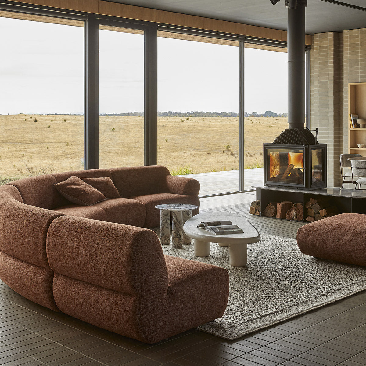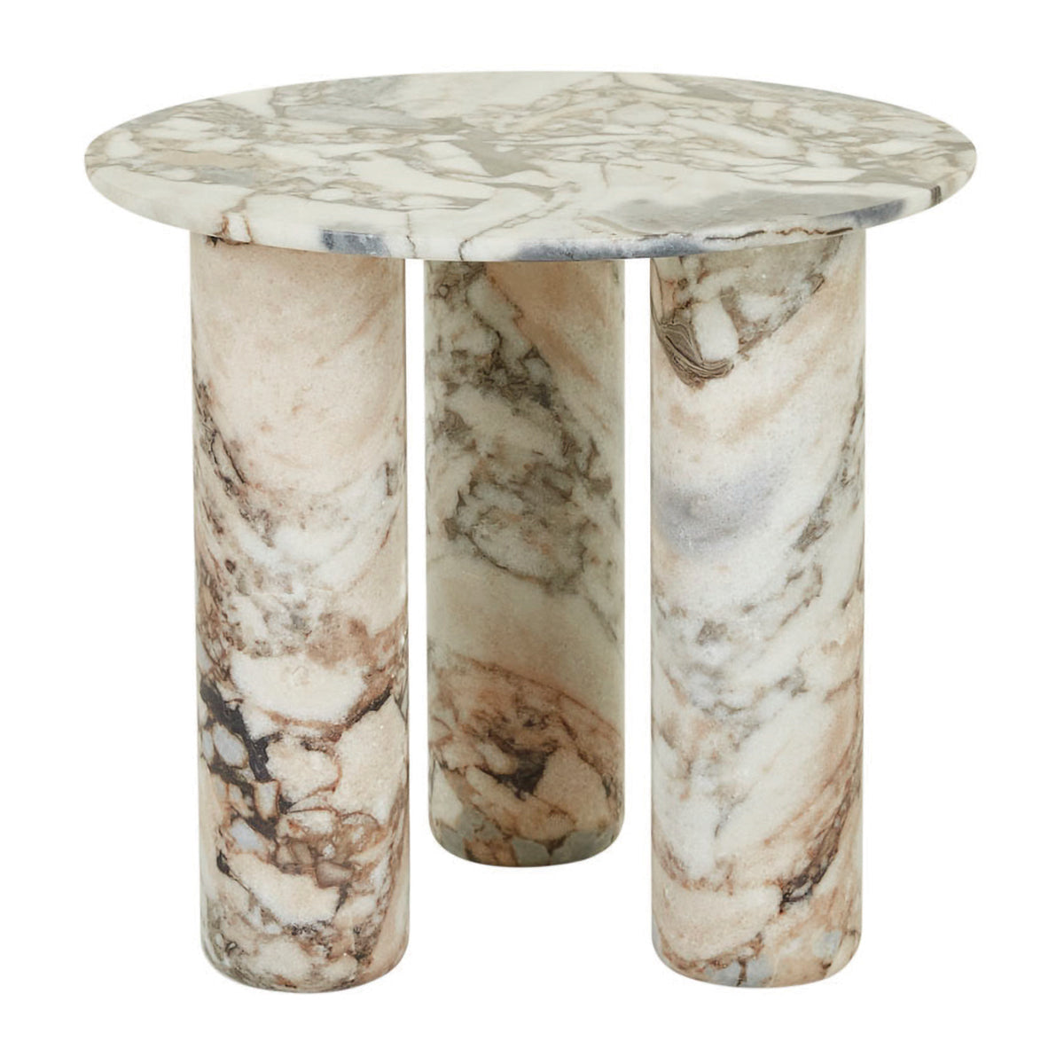 The Atlas Orbit Side Table is a striking piece of sculptural design, celebrating the raw elegance of natural stone. Crafted from richly veined marble in tones of green, cream, and charcoal, each table is truly one of a kind a work of art shaped by nature. Its three cylindrical legs and rounded top form a bold yet harmonious silhouette, exuding a sense of grounded sophistication.