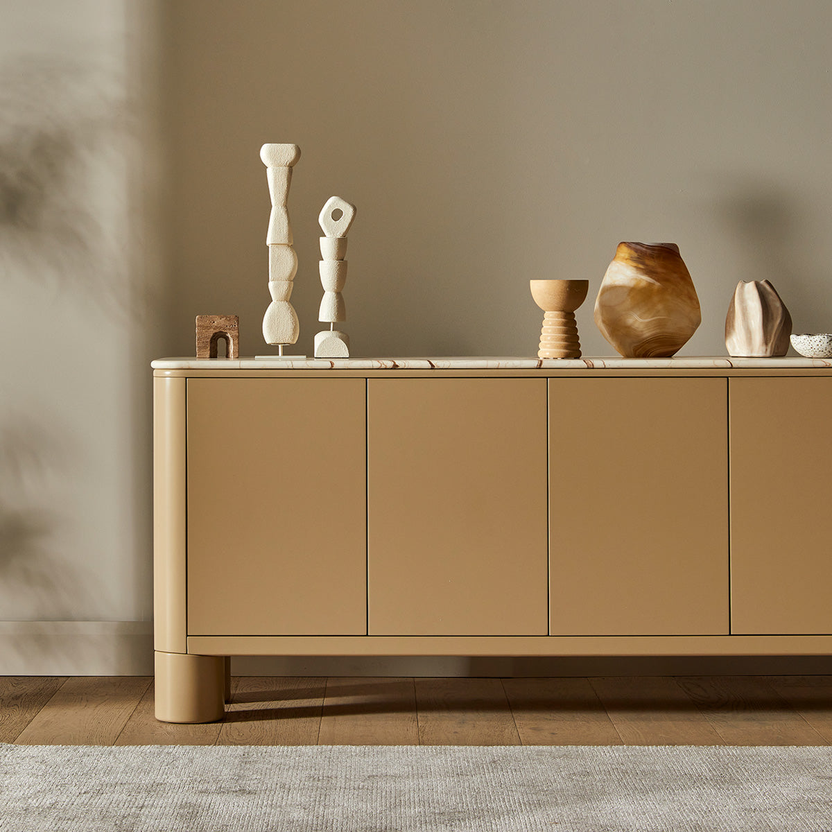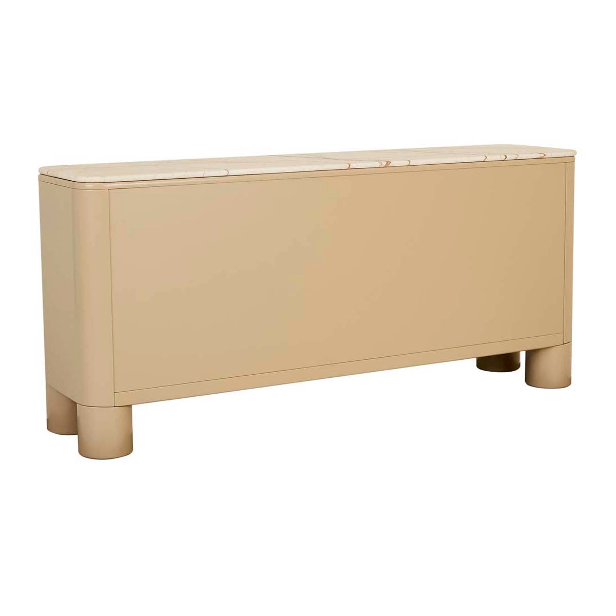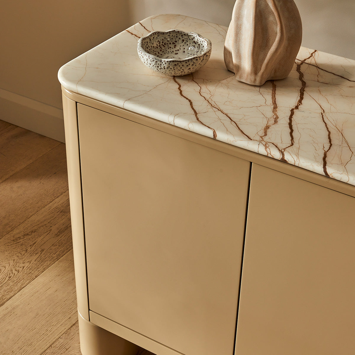 Add a touch of sophistication to your dining space with the Frankie Marble Buffet in Matt Ocean Marble and Gloss Navy. Its mixed material design, featuring a marble top and painted base, creates a striking visual appeal. Hettich hardware guarantees functionality, while ample storage space ensures practicality. Ideal for modern interiors, this buffet blends elegance with practical features.