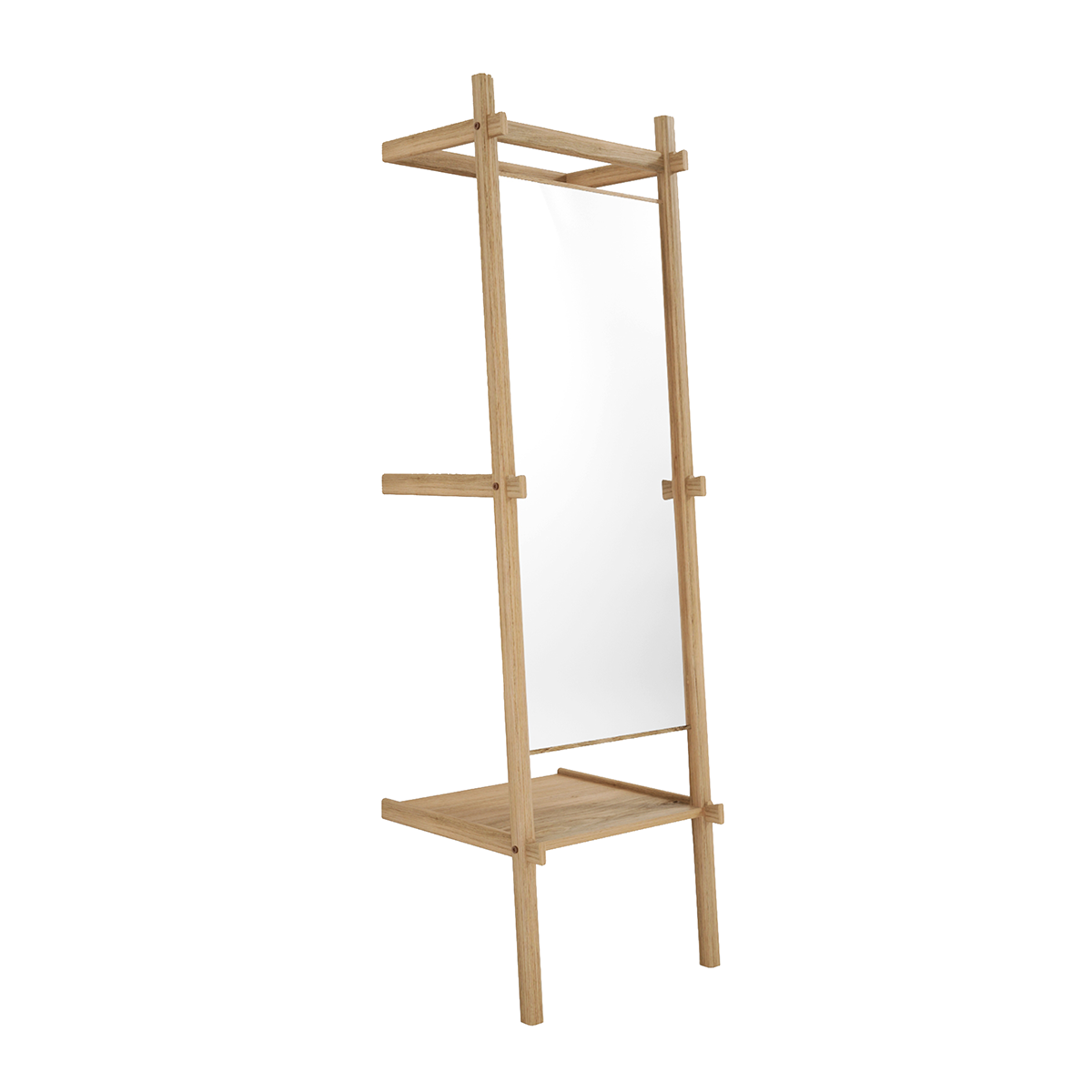 This simple, functional and fun standing mirror with shelf doesn't require much space. It is playful frame for shelves and niches.