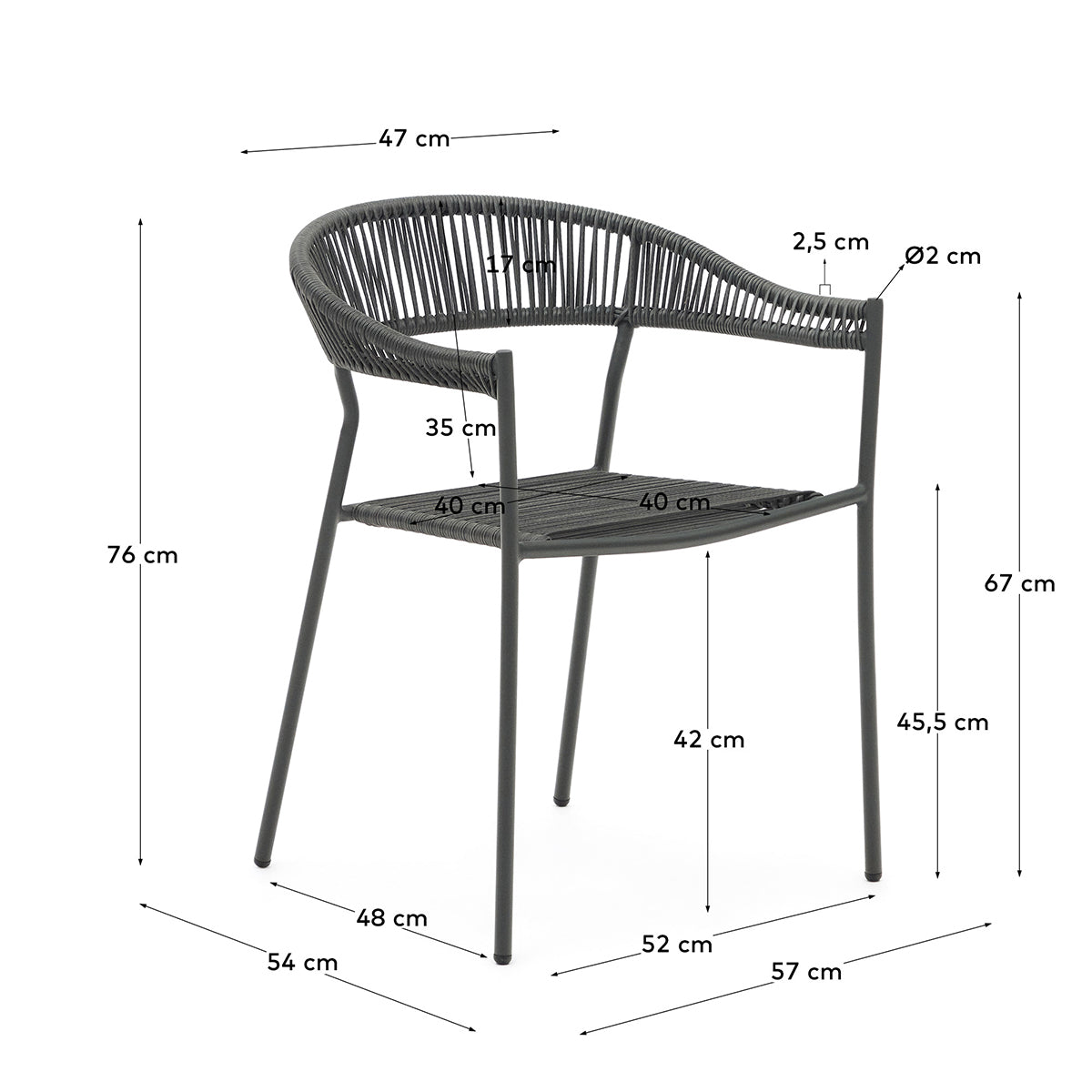 The Futadera Outdoor Dining Chair is a stylish stackable chair that will add visual interest to any alfresco space. The slender frame is crafted from painted steel, that is elevated by the synthetic cord design of its seat and backrest. The cord is UV-resistant to make this chair suitable for both indoor and outdoor settings. Its stackable design offers practicality with its ability to stack up to four chairs, ideal for those needing to save on storage space.