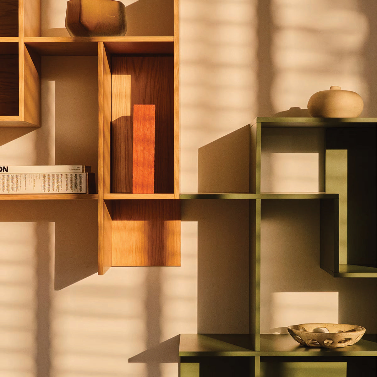 The Ina Modular Shelving Unit invites you to explore new forms of design through its unique modularity, available in finishes such as warm oak veneer and elegant matte green lacquer. Each module is a blank canvas that offers the possibility to create custom compositions to suit your space and style: rotate the modules at 90-degree angles and combine them in different positions and finishes to experiment with geometry and textures. Versatility, a minimalist aesthetic and design define this collection that transforms any space into a unique and personal place.