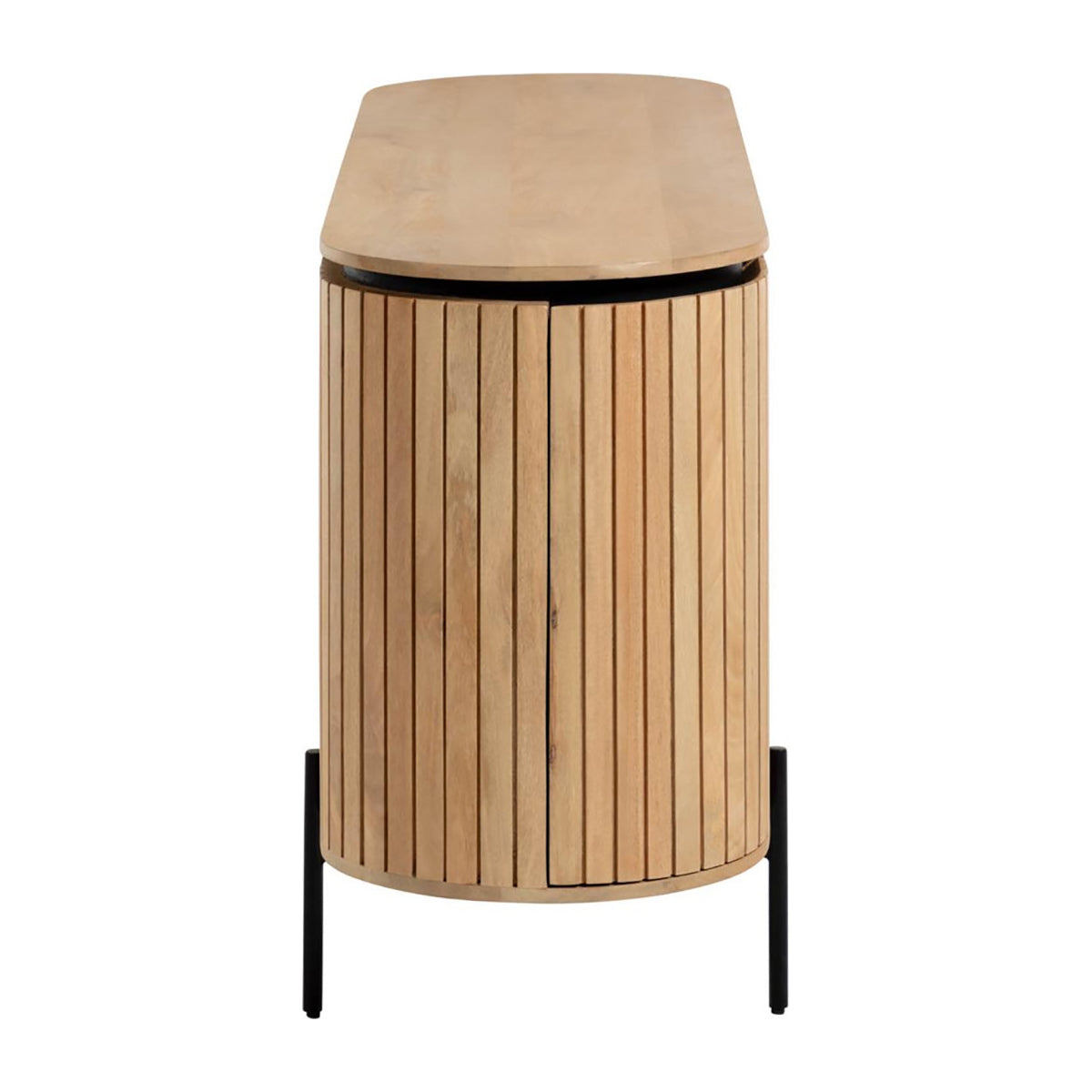 The Licia Sideboard is constructed from mango wood with pieces placed one-by-one that give it its shape and design. It has also been lacquered to brighten the colour of each piece polished and moulded by hand. The metal legs and details are painted with a matte black finish and have been left exposed, allowing you to open the doors without needing handles.