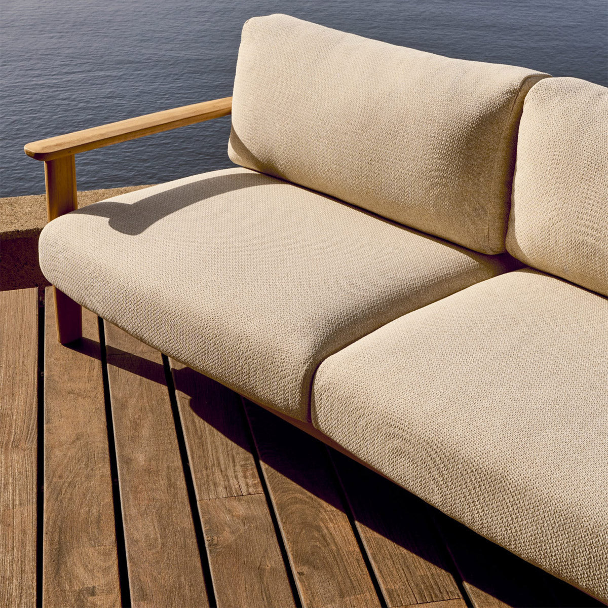 The Tirant 3-Seater Sofa is crafted from solid teak wood, inspired by the simplicity of Japanese design. The removable cushions feature reticulated foam, allowing water to pass through without being retained inside to ensure a faster drying time. Its clean lines highlight the natural warmth and beauty of the wood, ideal for elevating your outdoor styling.