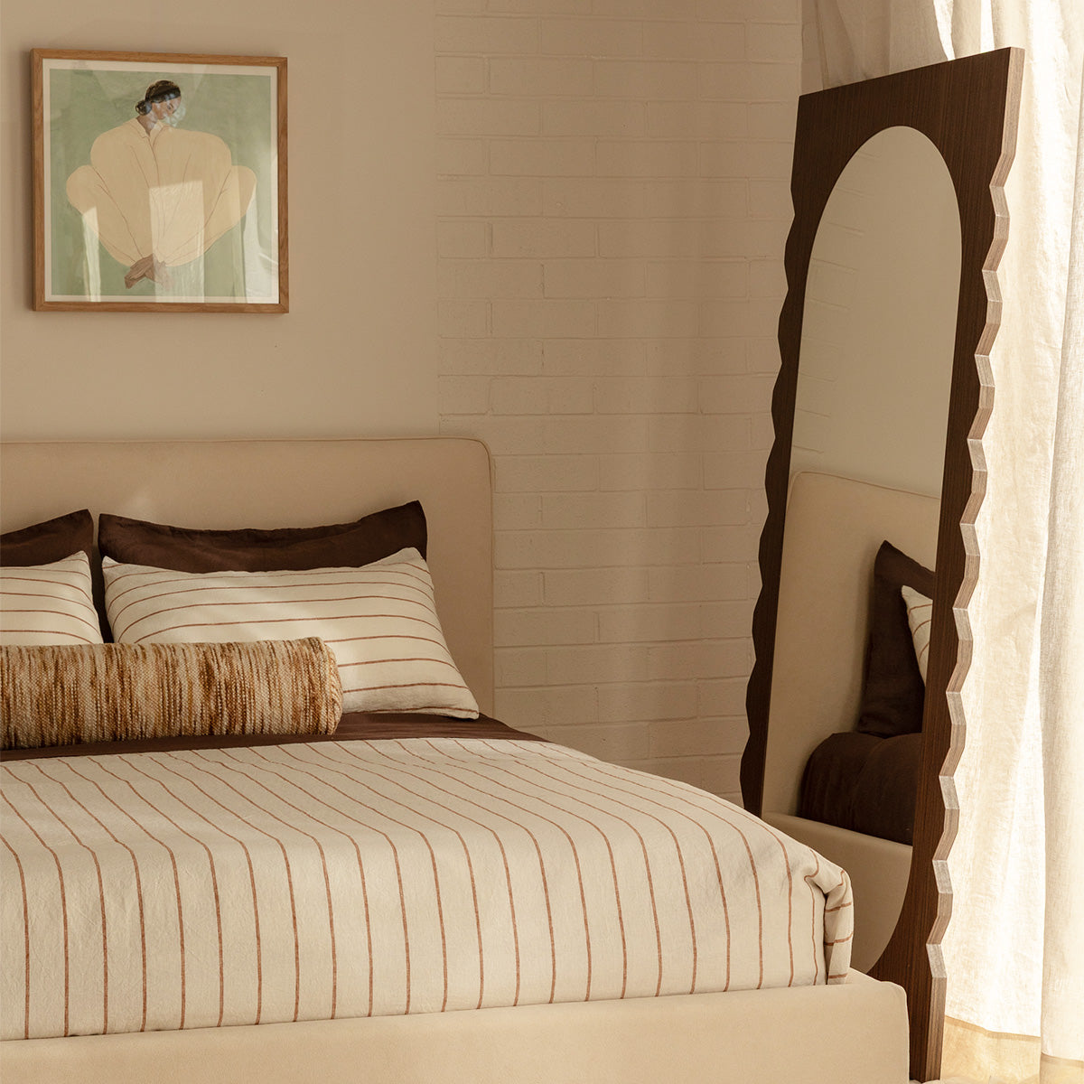 Playful and elegant, the Azzurra Floor Mirror is a unique decor piece ideal to elevate your home. Crafted from walnut veneer, its decorative frame showcases a visually interesting silhouette, combining sleek lines with a distinctive geometric edge. Perfect for contemporary spaces, this mirror brings texture and depth to your home with its rich wooden finish and light reflecting abilities. The Azzurra Wall Mirror doubles as an art piece, and will be a stunning addition to any entryway, living area, or bedroom.