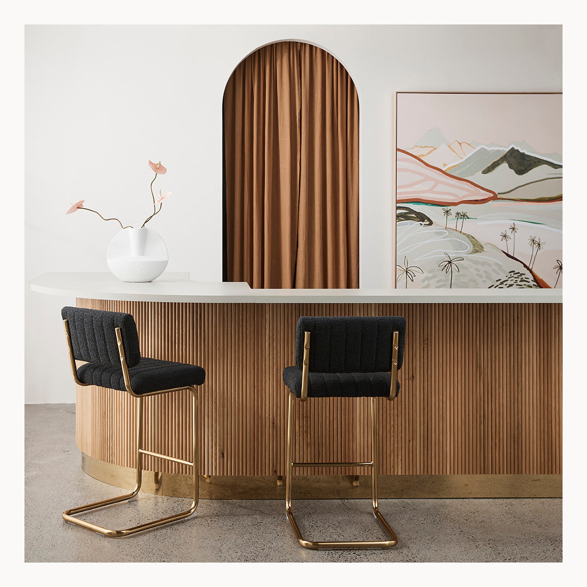 The Blake Boucle Bar Stool combines modern aesthetics and luxurious comfort to make a strong design statement in any kitchen space. Crafted from solid steel, the frame features a stunning cantilever structure that brings a unique focal point of visual interest to its design. Elevated by elegant vertical stitched details, the seat and backrest contrast the steel material with a soft boucle fabric to create a beautiful interplay of textures, whilst offering supreme support with plush foam padding. The Blake comes in various timeless colours and finishes, allowing you to find the perfect one to suit your unique taste and home.
