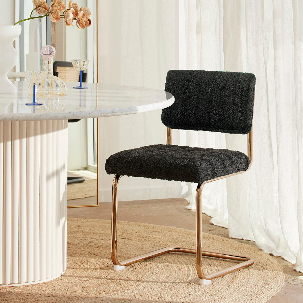 The Blake Fabric Dining Chair is a stylish seating solution ideal for any dining space in need of a sophisticated touch. Crafted from solid steel with an incredible cantilever structure, this chair details a tactile design with its plush, upholstered seat and backrest that is elevated by elegant, stitched design details. Available in various timeless colours and finishes, this chair combines luxurious textures with modern aesthetics to enhance the visual appeal of your dining room while offering unparalleled comfort.