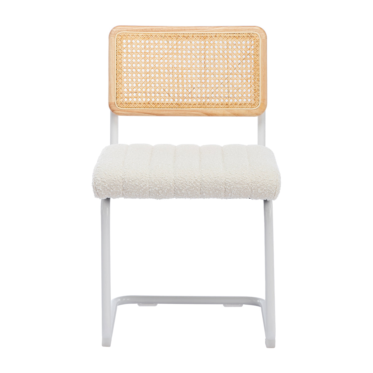 The Blake Rattan Boucle Dining Chair combines modern aesthetics and luxurious comfort to make a strong design statement in any dining space. Crafted from solid steel, the frame features a stunning cantilever structure that brings a unique focal point of visual interest to its design. The contrasting materials of the natural rattan backrest and soft boucle seat create a beautiful interplay of textures, whilst offering supreme support with plush foam padding. The tactile and visually appealing aesthetic of this chair will elevate your interiors, and last your home for years to come.