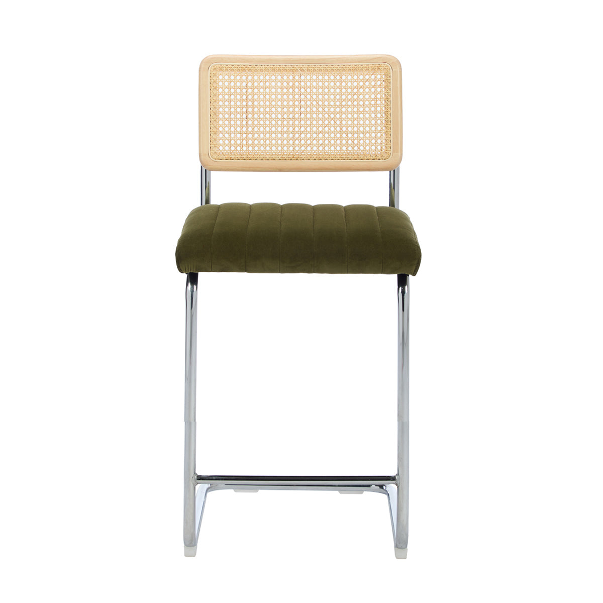 The effortlessly stunning, Blake Rattan Velvet Bar Stool, is the perfect combination of style and comfort bringing a fresh sense of personality to your kitchen island. Supported by a solid steel cantilever frame for lasting durability, this striking stool features a sumptuous velvet upholstered seat with elegant stitched details. The backrest showcases the natural beauty of rattan, adding an additional element of textural interest and warmth. The unique blend of materials work harmoniously together, creating the tactile and visually appealing aesthetic of this stool