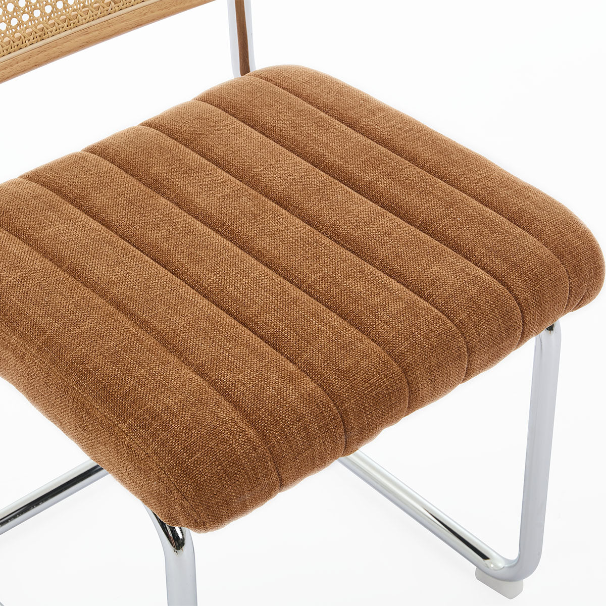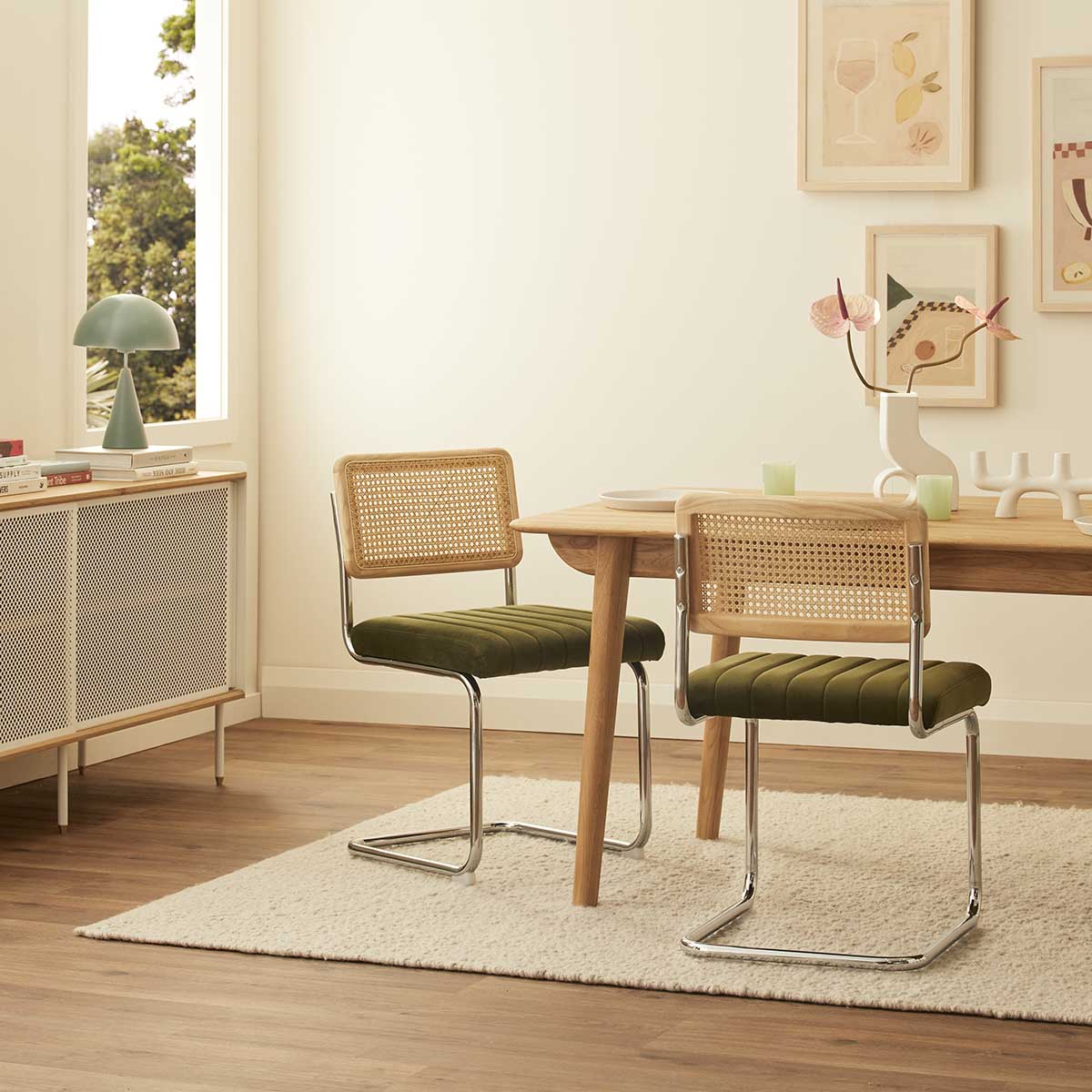 The Blake Rattan Fabric Dining Chair combines modern aesthetics and luxurious comfort to make a strong design statement in any dining space. Crafted from solid steel, the frame features a stunning cantilever structure that brings a unique focal point of visual interest to its design. The contrasting materials of the natural rattan backrest and soft fabric seat create a beautiful interplay of textures, whilst offering supreme support with plush foam padding. The tactile and visually appealing aesthetic of this chair will elevate your interiors, and last your home for years to come.