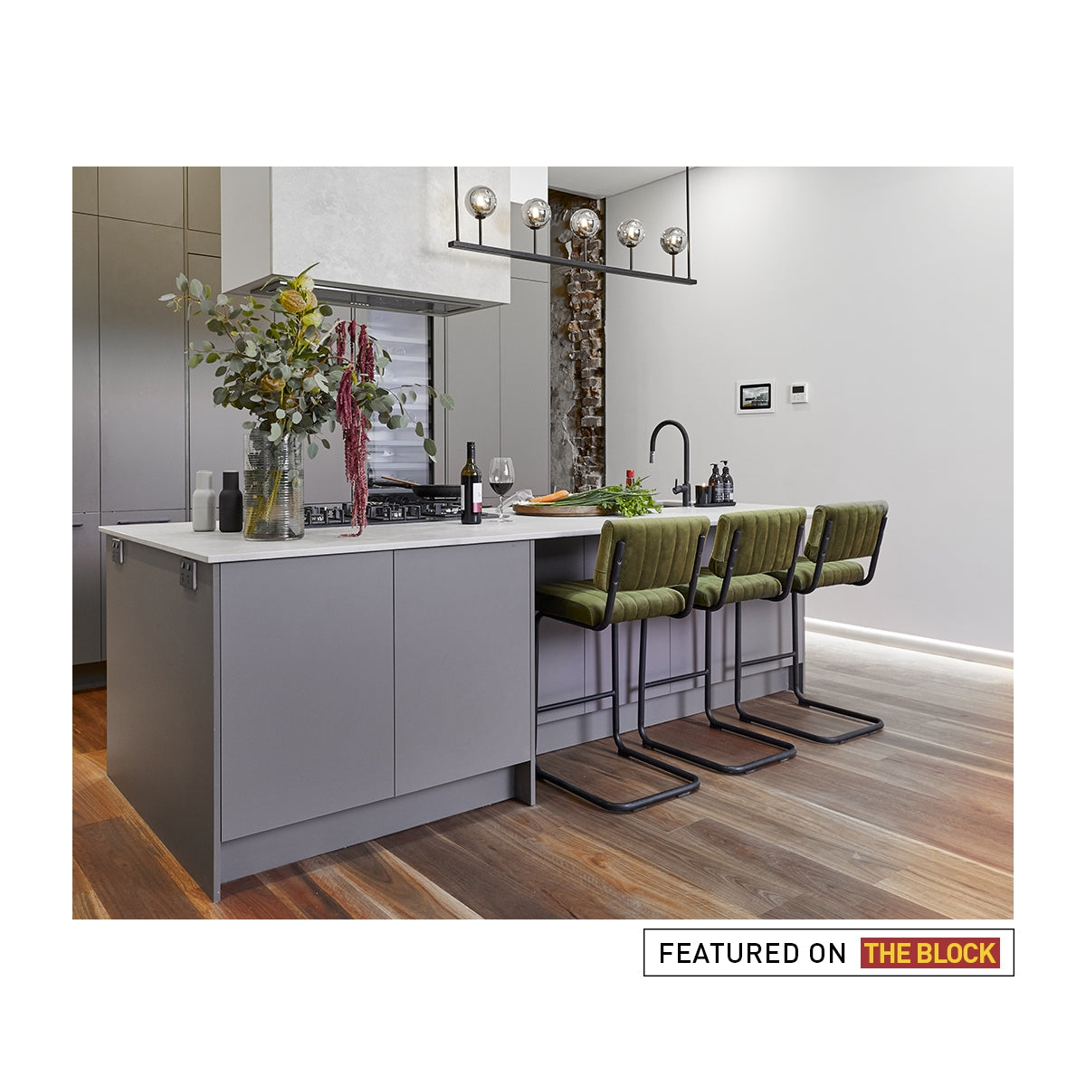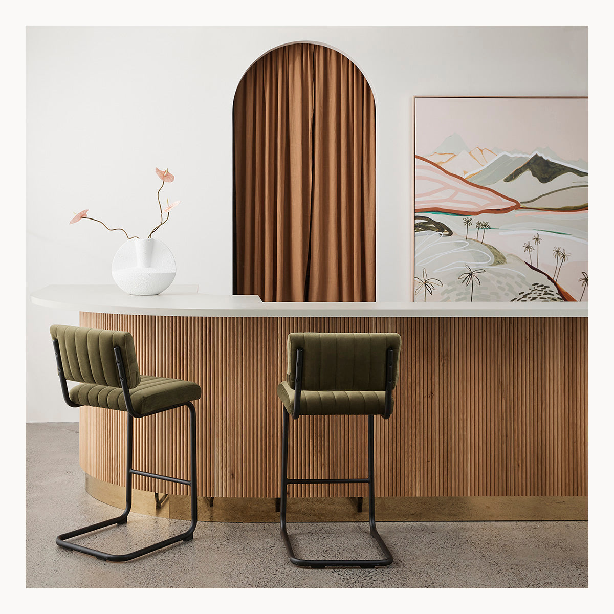The Blake Velvet Bar Stool combines modern aesthetics and luxurious comfort to bring an unapologetic luxe to any kitchen space. Crafted from solid steel, the frame features a stunning cantilever structure that brings a unique focal point of visual interest to its design. Elevated by elegant vertical stitched details, the seat and backrest contrast the steel material with an opulent velvet upholstery to create a beautiful interplay of textures, whilst offering supreme support with plush foam padding. The Blake comes in various timeless colours and finishes, allowing you to find the perfect one to suit your unique taste and home.