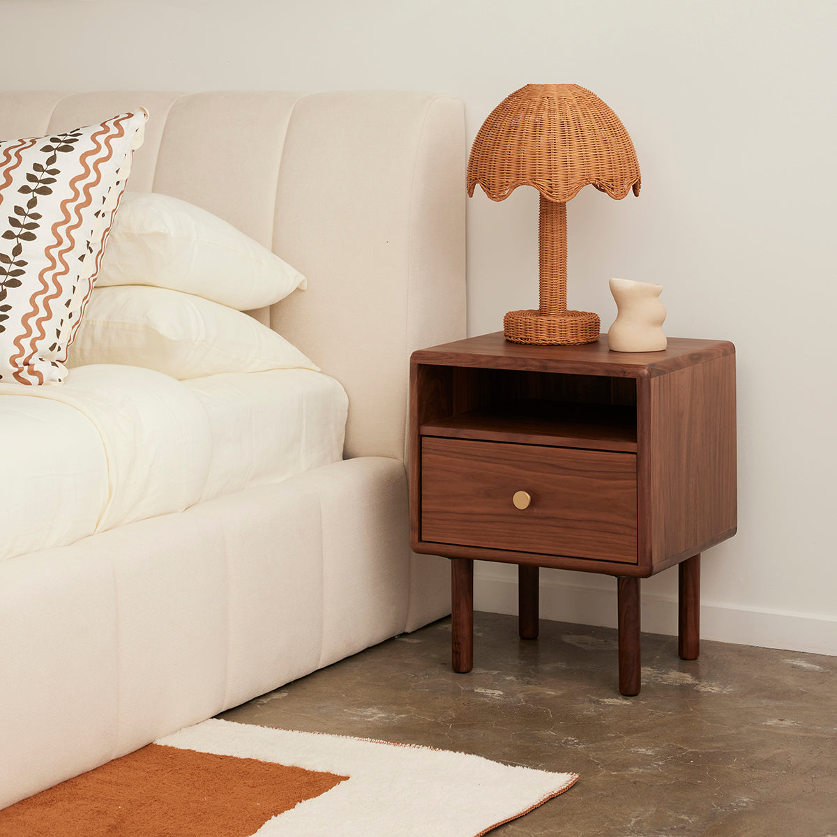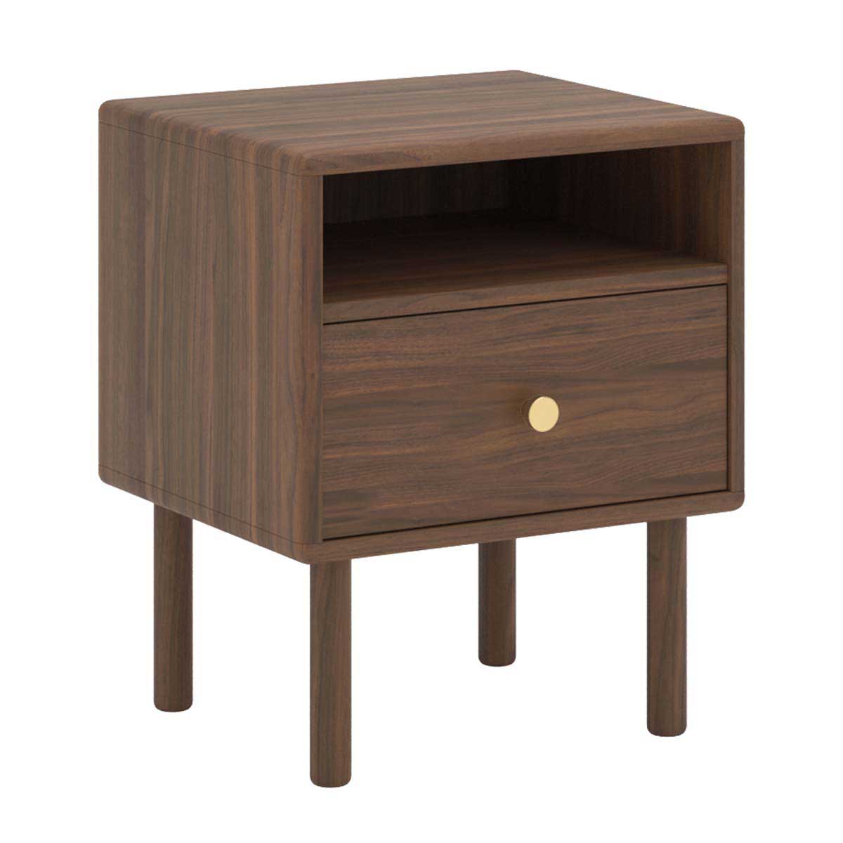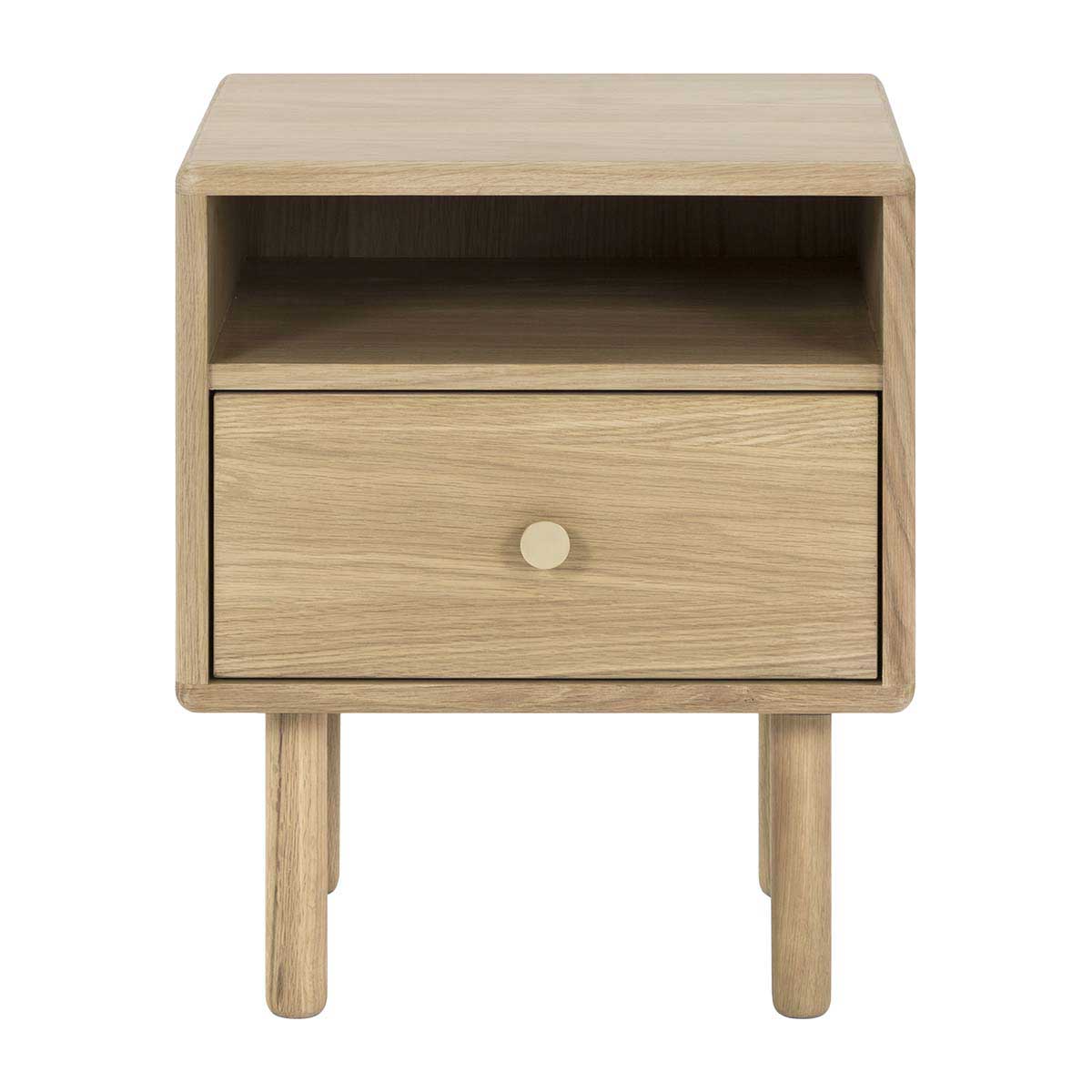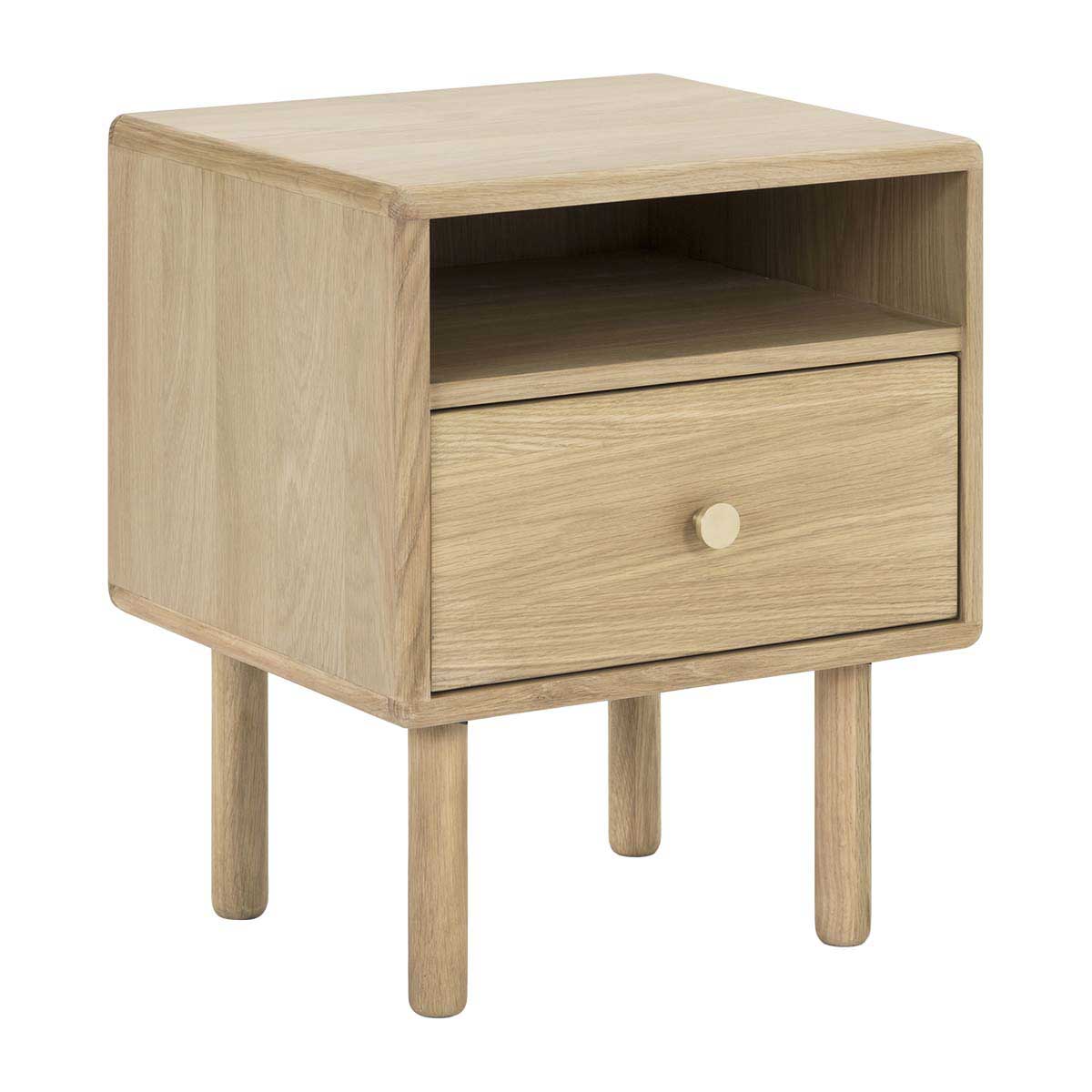 The Brass Bedside Table is an elegantly designed piece with subtle rounded edges and natural appeal. Crafted from natural timber veneer, this piece exudes Scandi sophistication and simplicity. It features an open shelf and spacious drawer adorned with sleek brass hardware, providing a stylish storage solution for your bedside essentials. Perfectly combining functionality with timeless design, this bedside table will be a stunning addition to any contemporary bedroom.