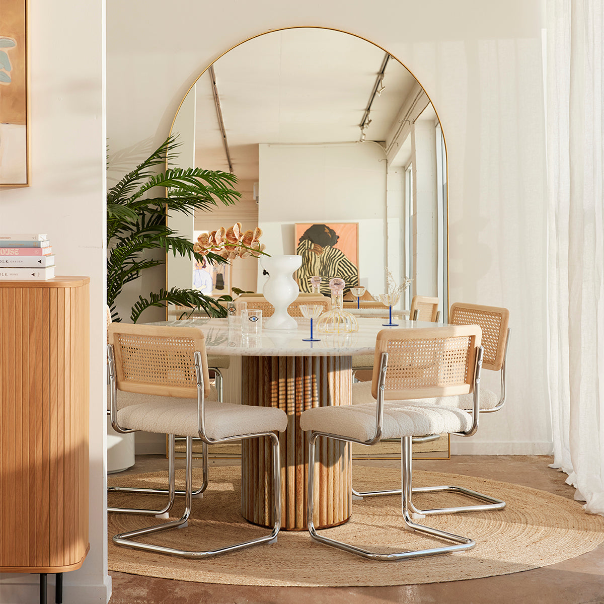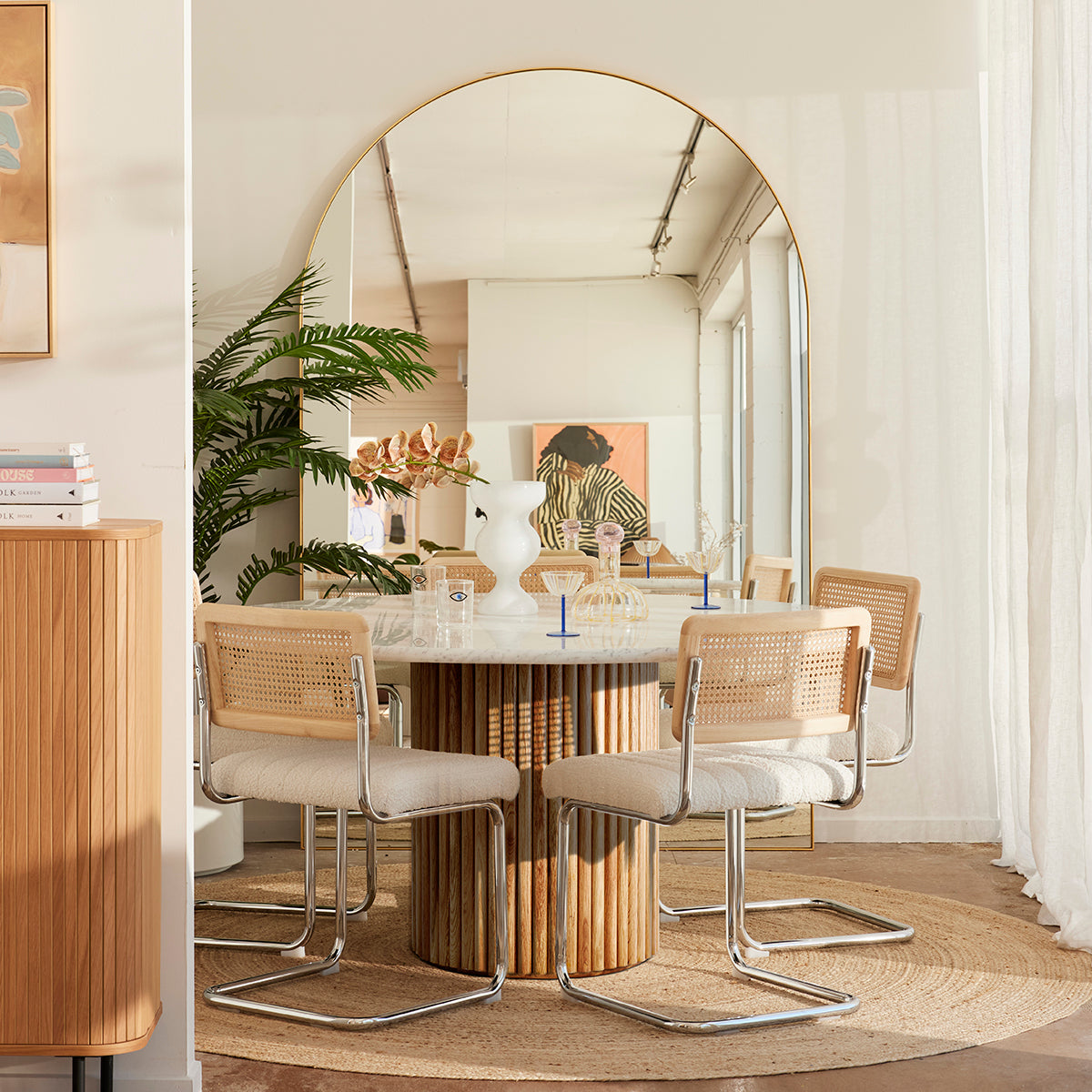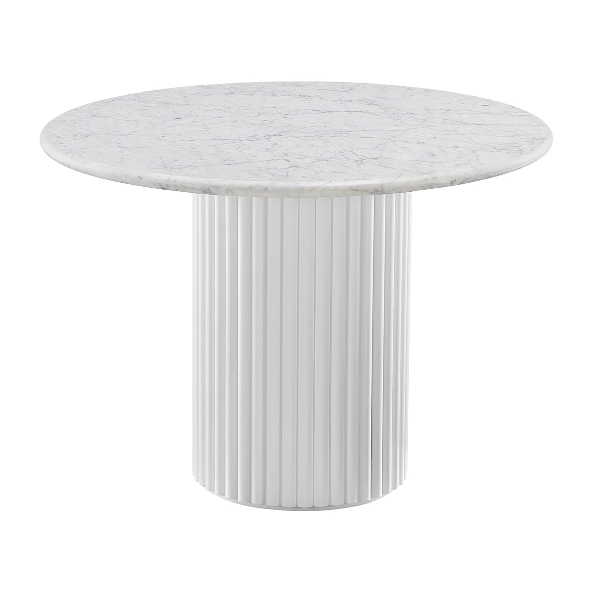 The Cosmos Dining Table is a timeless and contemporary statement for your dining space, with a circular Italian carrara marble top and American Oak timber clad column base. Available in multiple timber finishes, browse the collection for side table, dining table and console table options.