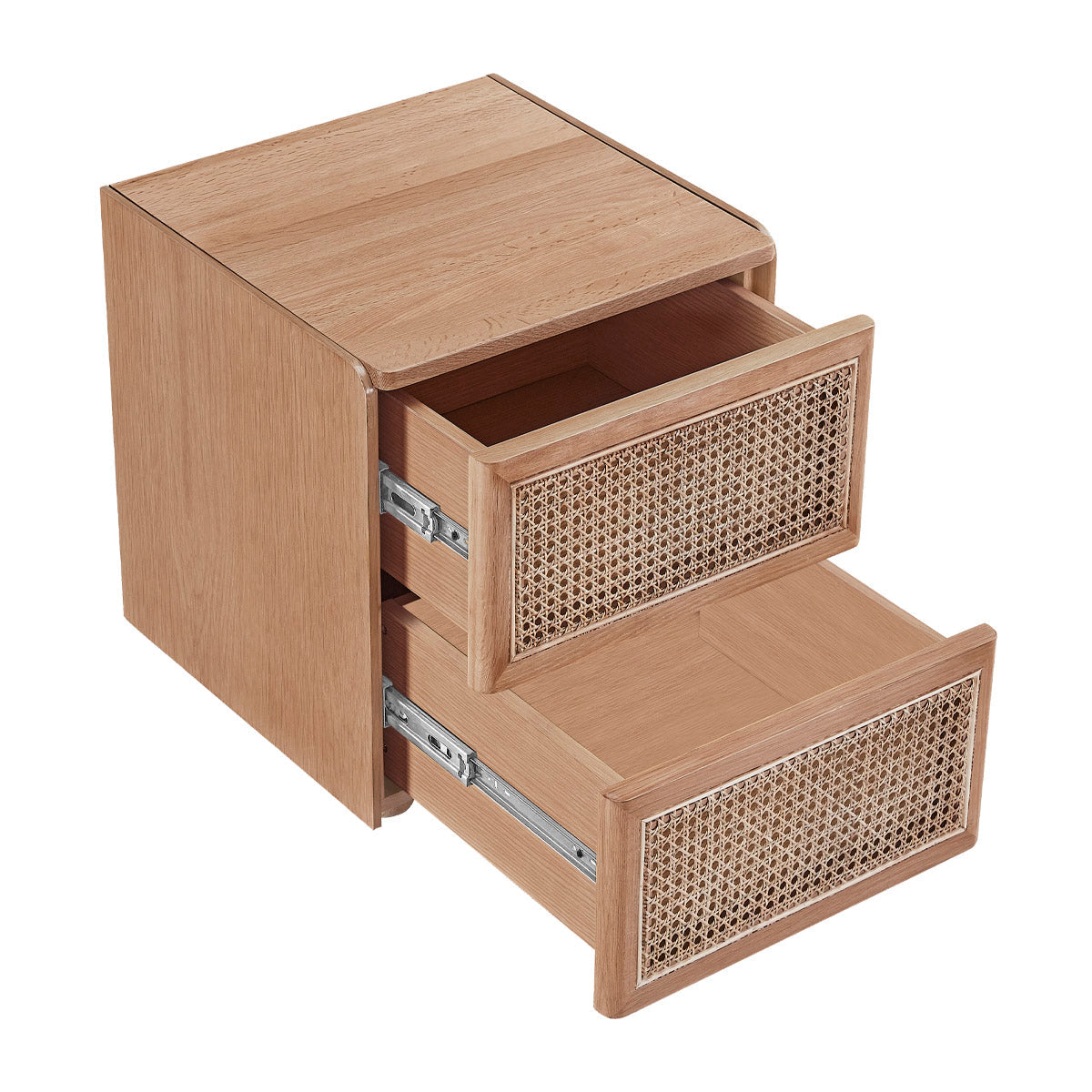 Boxy and simple, the Delta Rattan Bedside Table brings a refined touch to your bedroom with its elegant blend of solid and veneer oak construction. Featuring two soft-close drawers adorned with woven rattan fronts, this piece provides ample storage space while maintaining a stylish profile. The combination of materials enhance its design, allowing the rich texture of the wood and natural finish of the rattan to take centre stage. A perfect companion for any modern or contemporary space, this bedside embodies timeless style and practical functionality.