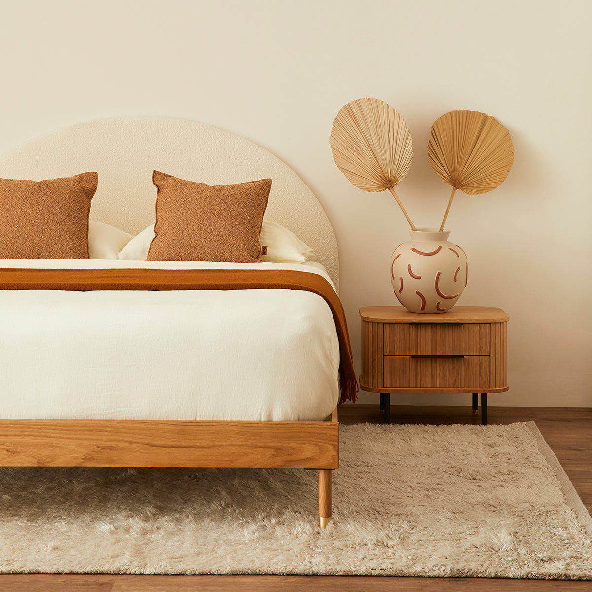 The Harlo Bed Head is a simple arched bed head, beautifully upholstered in contemporary shades of velvet,fabric or boucle.