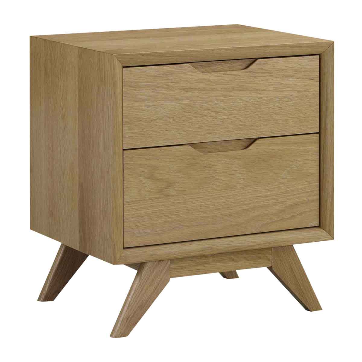 The Jude 2 Drawer Bedside Table is a timeless piece, featuring an angular silhouette and clean lines. This bedside table beautifully combines style and functionality, with its duo of spacious drawers, scalloped handle detail and tapered legs. Crafted from a mix of solid timber and high-quality timber veneer, it is built to last, making it an ideal addition to any bedroom or lounge.