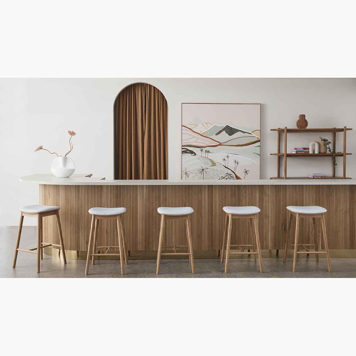 Featuring a simple silhouette, the Lando Fabric Backless Bar Stool is the Scandi-inspired piece that will elevate your kitchen space to new heights. The curved seat is enhanced with a plush fabric upholstery and comfortable padding, inviting relaxation with an air of class to any space. With its timber frame and classic form, this versatile stool is the perfect addition to your home, effortlessly blending with both modern and traditional interiors.