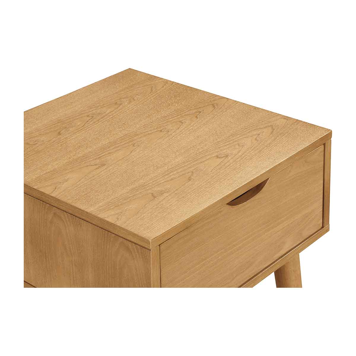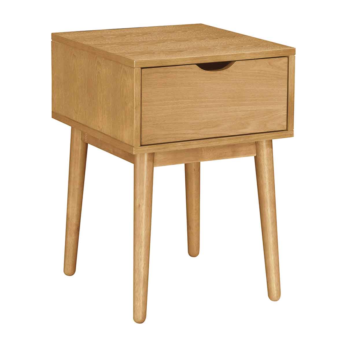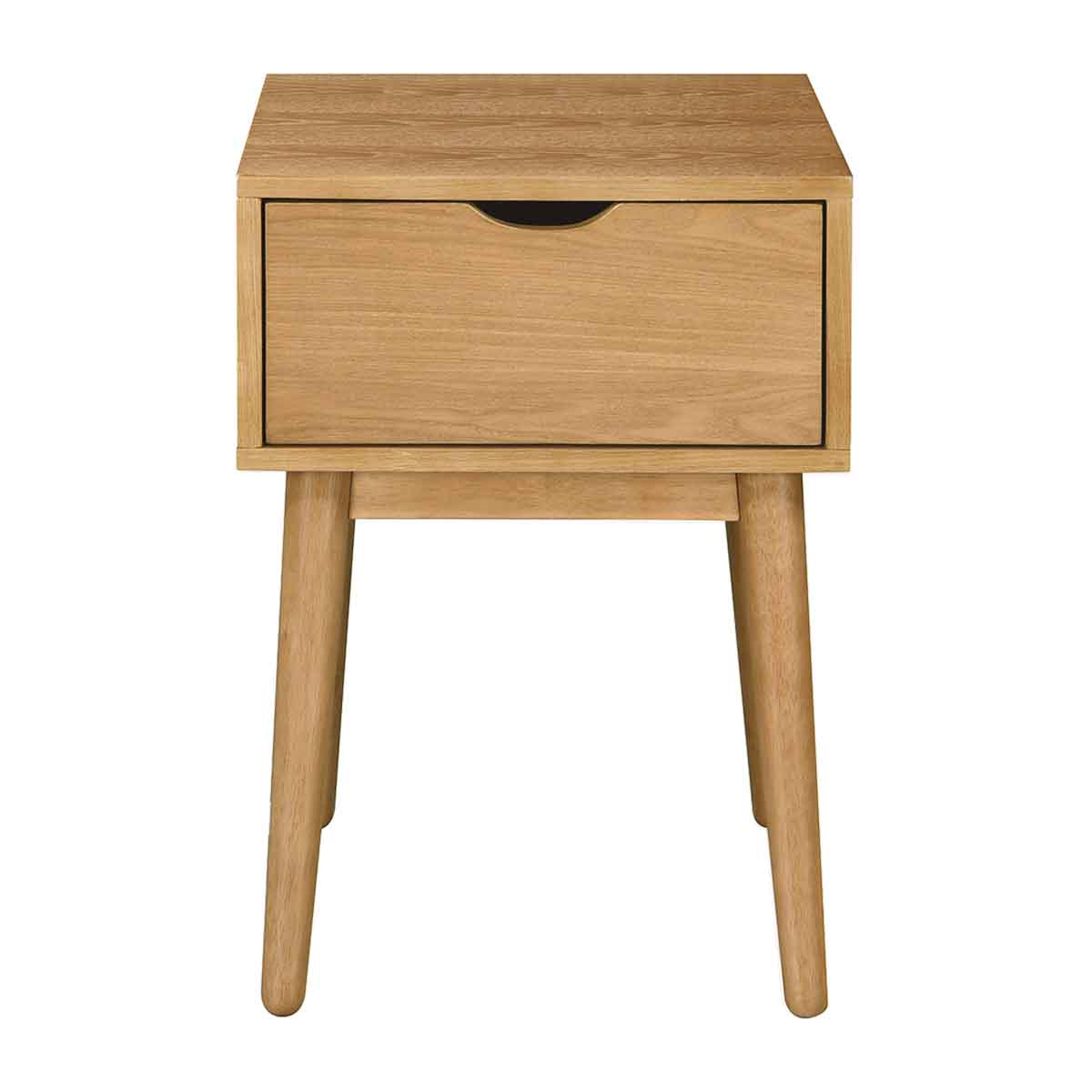 The Luna High Bedside Table offers a harmonious blend of Scandinavian simplicity and functional design. Crafted from timber, it features a spacious drawer with a sleek cutout handle for easy access and subtle tapered legs that add a touch of mid-century modern interest. Its uncomplicated form allows the beauty of organic wood grain patterns to shine and creates a refined, textured finish. Perfect to pair with taller beds, the Luna High Bedside complements any bedroom decor, bringing both style and practicality to your space.