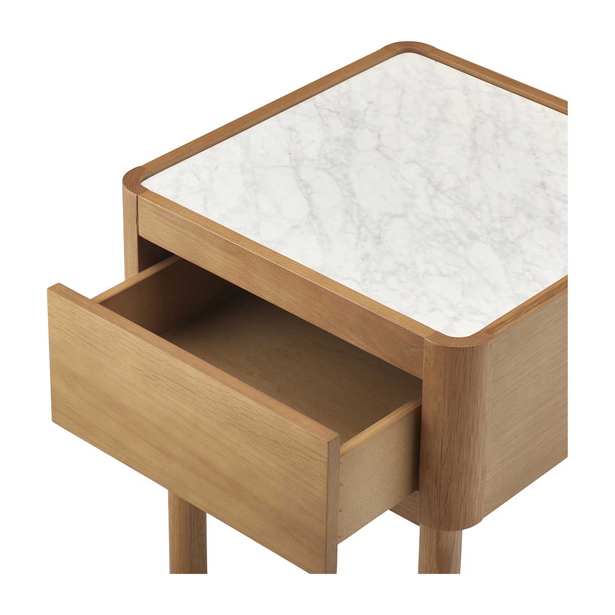 The Norah Marble Bedside Table pairs oak timber with solid Carrara marble in a Scandinavian-inspired design. Balancing both form and function, this piece emphasises rounded edges and timeless appeal, with a spacious storage drawer for keeping bedside essentials stored and organised. Its stunning marble top and smooth oak finish offer warmth and elegance that is perfect for adding a refined natural touch to your space. Built to last, the Norah is a luxurious yet understated addition for any bedroom in need of some stylish character.