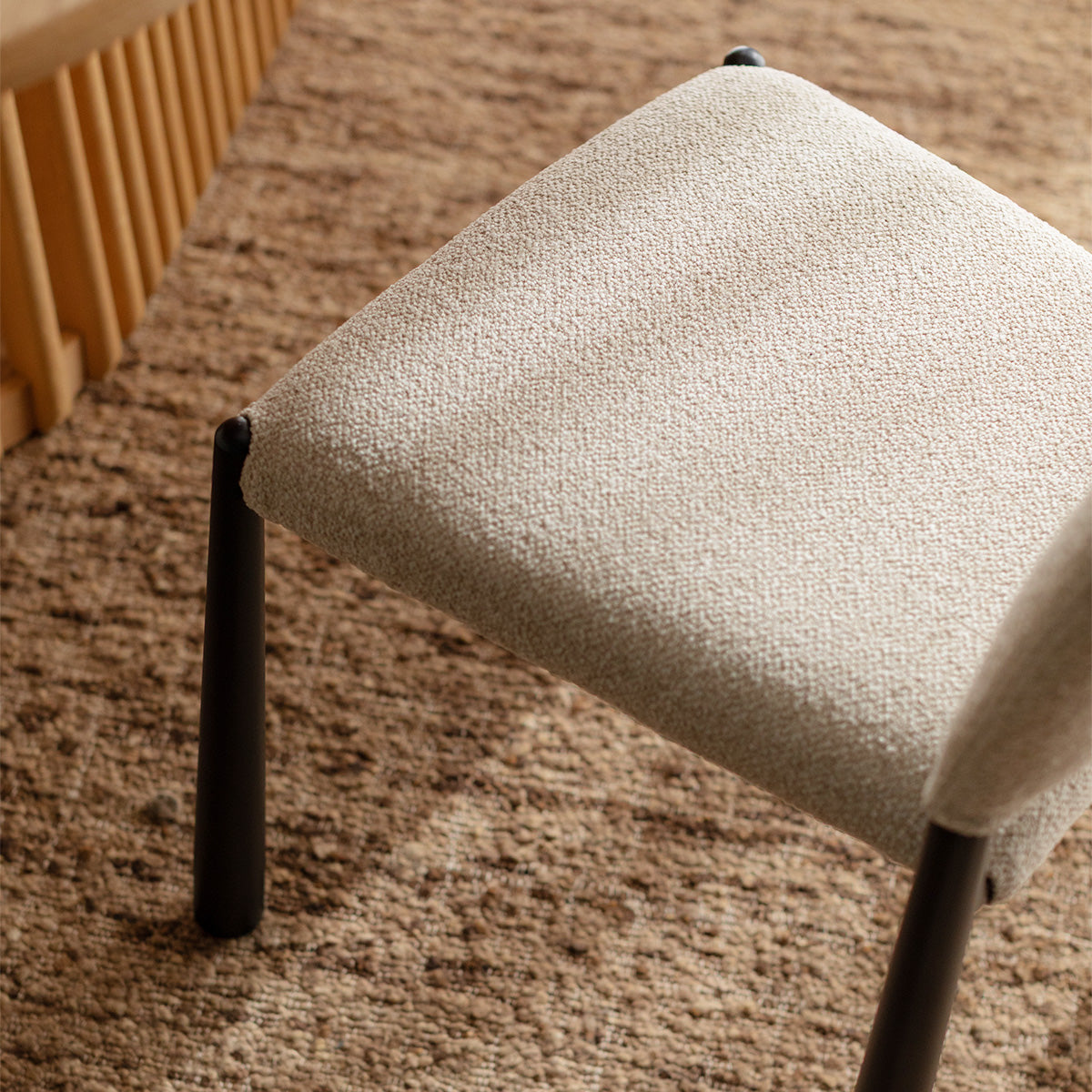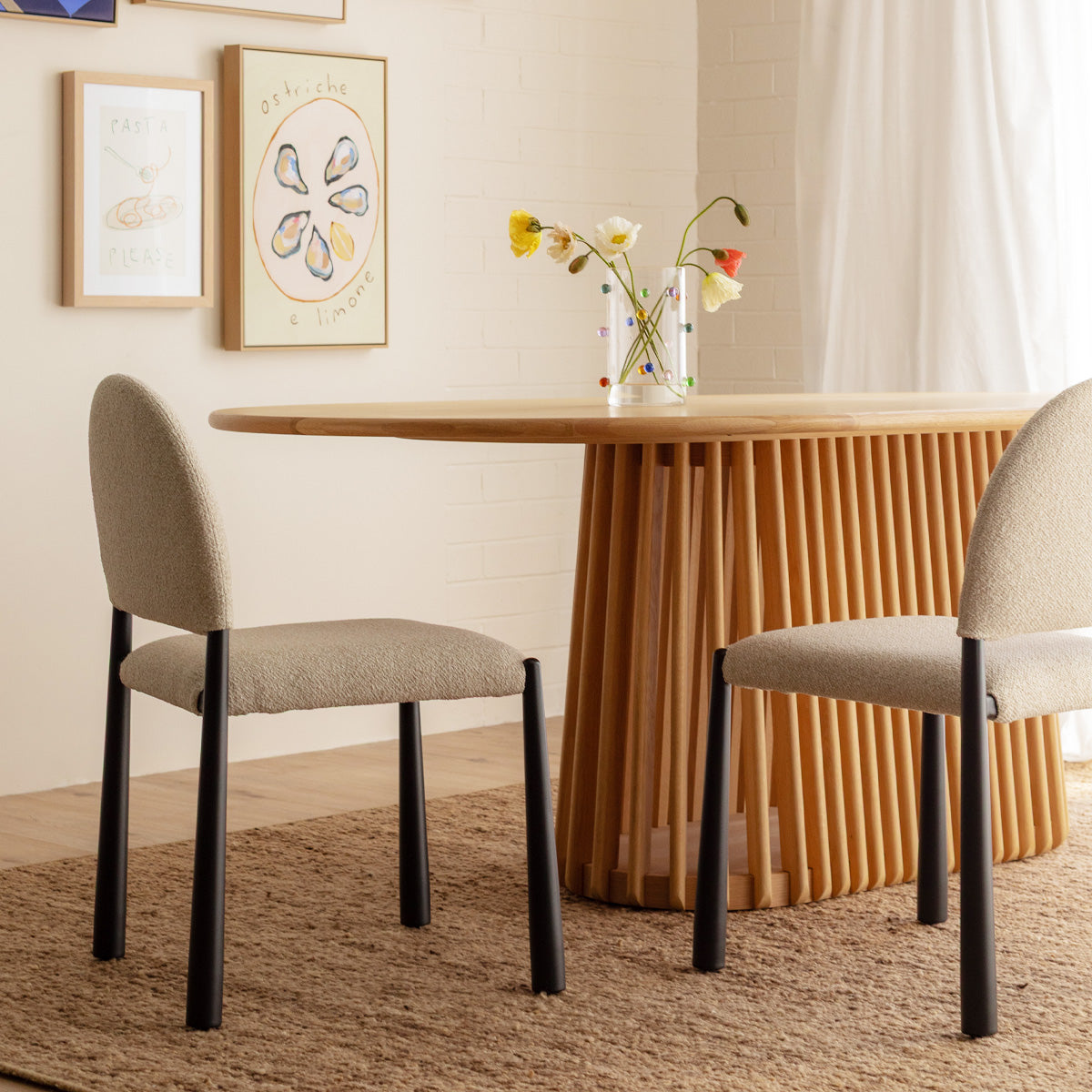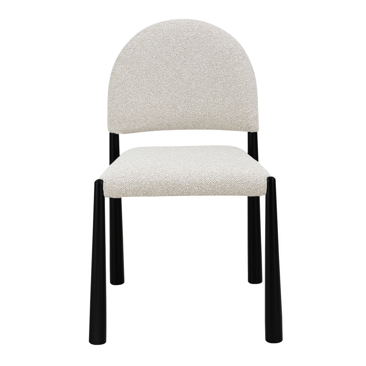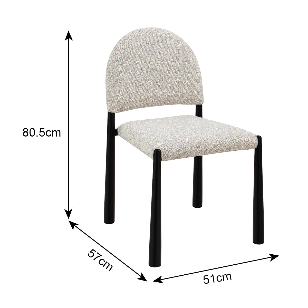 The Valentina Dining Chair is a contemporary approach to a relaxed, minimalist aesthetic. Featuring a stunning arched silhouette, its seat and backrest boast a playful boucle upholstery. The steel legs add another element of texture against the boucle, and detail a unique shape that elevates its look. Perfect for any dining space, the Valentina will bring the perfect balance of comfort and style to your home.