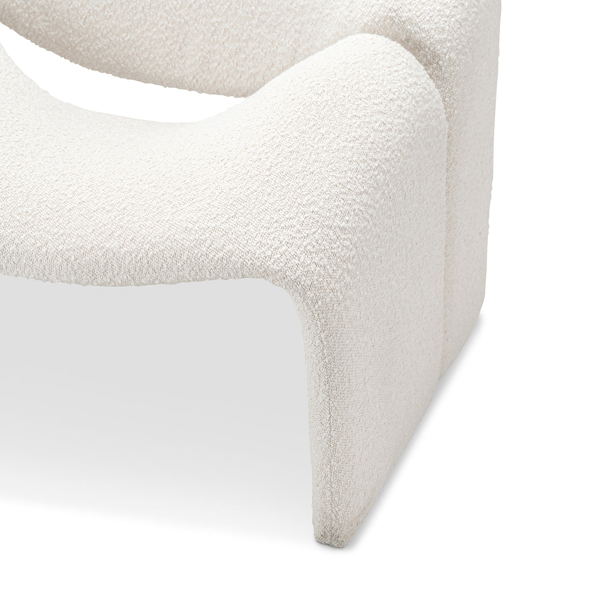 Hailing from the 1970s, the Billie Groove Boucle Armchair is inspired by a Pierre Pauline classic design. Its gently curved backrest and seat form a sculptural M frame that is delicately upholstered in a sumptuous boucle wool and is supported by a sturdy all-metal frame. This piece exudes comfort and relaxation with its flowing rounded edges reminiscent of waves. Its chic silhouette and soft textures pair effortlessly with ultra-modern minimalist interiors, inviting any user that is seeking to lay within a sculpture in the round.
