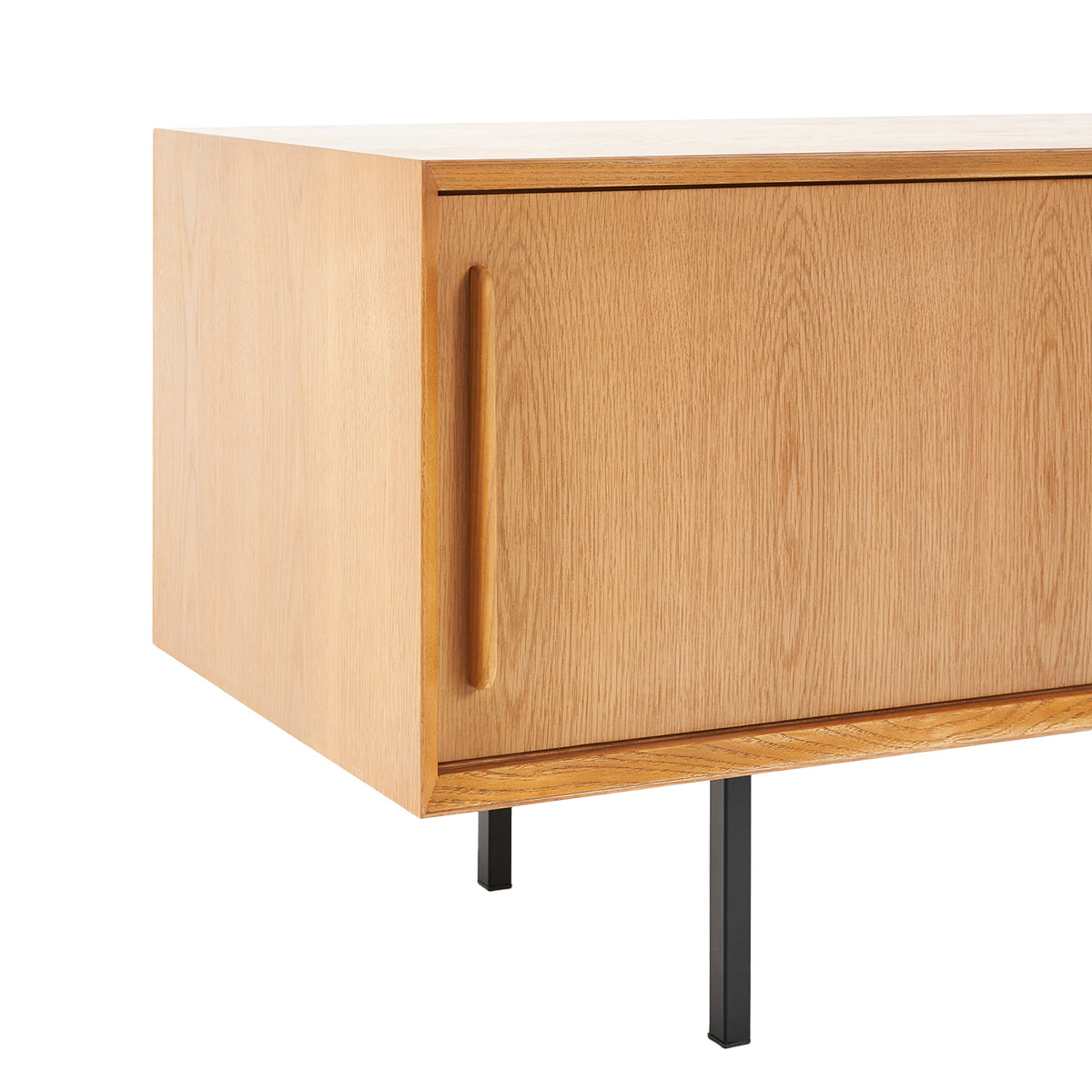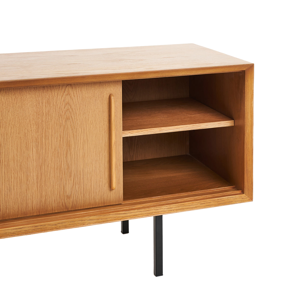 The Slater 2 Door Buffet oozes Australian style. This oak buffet unit is the perfect storage piece for any home with its natural oak colouring, contemporary design, and sleek black legs. With the convenient internal shelving, this piece functions to accommodate your serving dishes and dining pieces in a sleek organised manner. The sliding panel doors allow for a seamless and smooth operating experience at your busiest dinner parties.