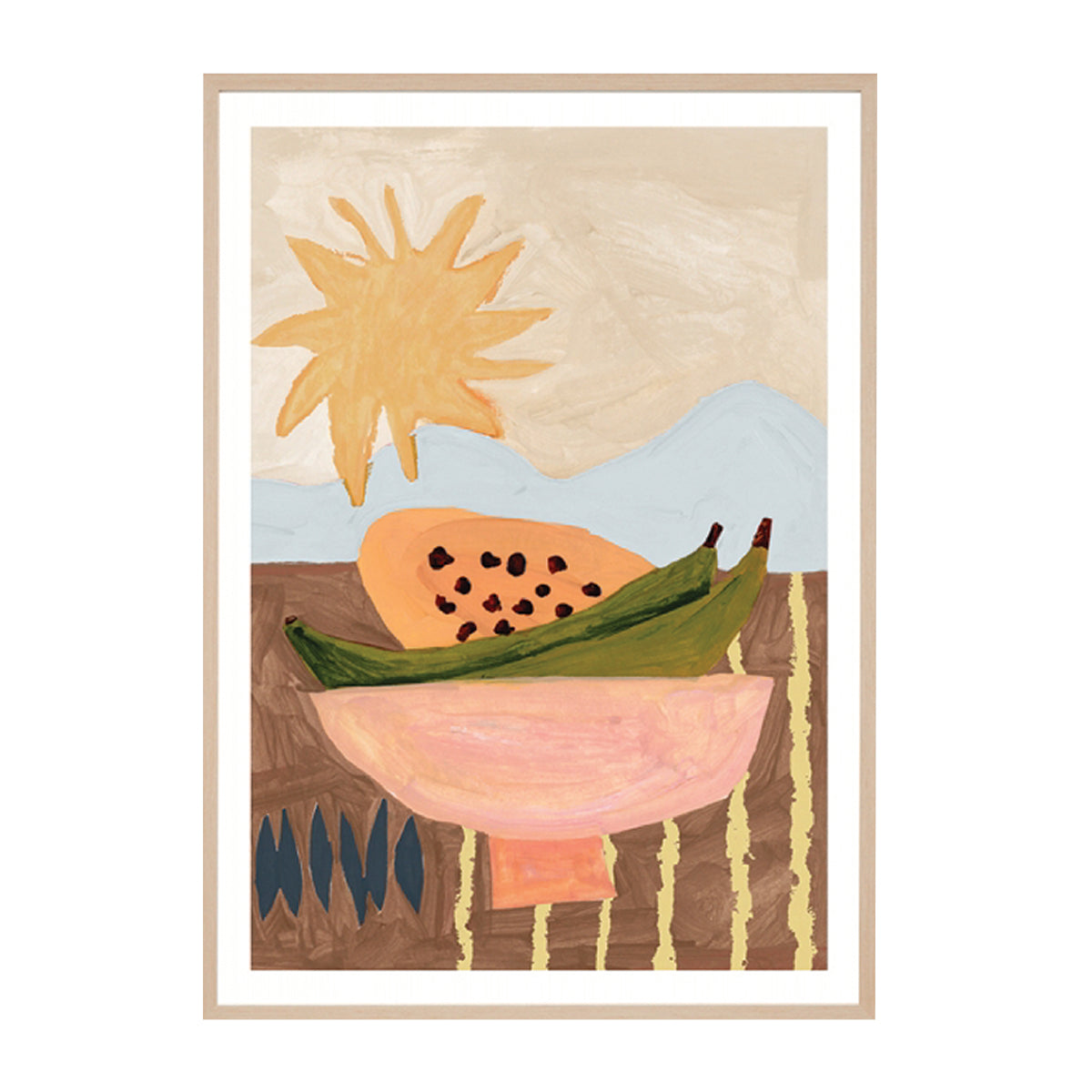 Brighten your home with the sun-drenched tones of the Papaya Sunrise Blue Art Print. Featuring a playful still life of tropical fruit beneath a radiant sun, this contemporary artwork captures the laid-back joy of summer mornings. Its palette of soft blues, peachy pinks, and golden neutrals evokes warmth and vitality, while hand-painted textures bring an authentic, artisanal charm.
