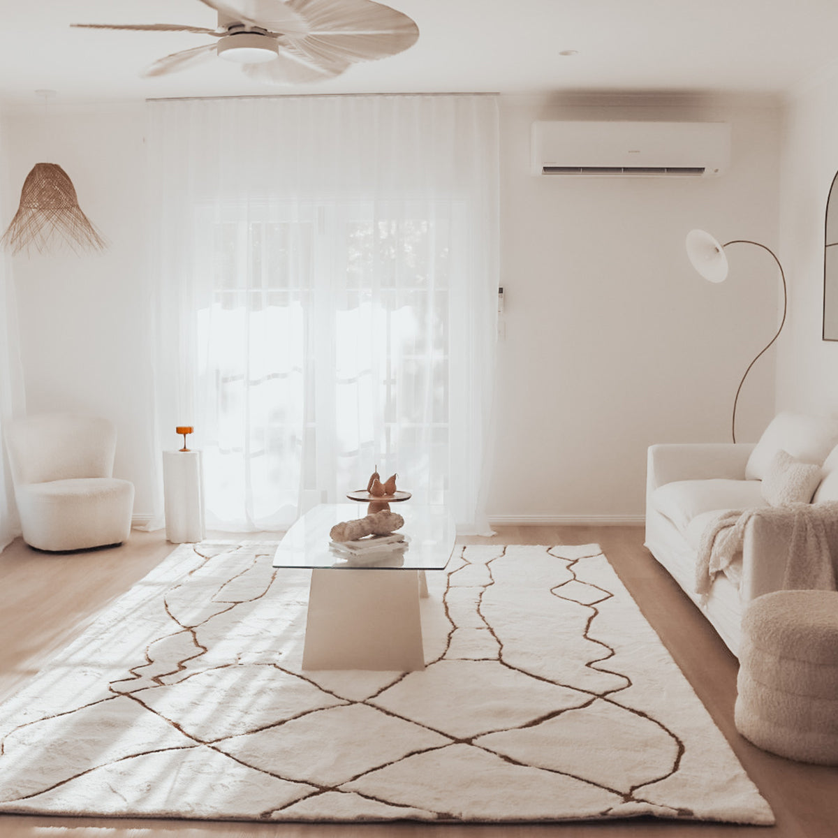 Alayna is a stunning carved shag rug by Miss Amara, featuring a blend of cream complemented by an abstract tribal pattern in gold.An iconic design piece, Alaynas colour palette and unique design make it timeless and versatile. The perfect addition to a modern, tribal, bohemian or vintage style space. This hard-wearing fibre is stain-resistant and ideal for high-traffic zones, kids and pet-friendly homes.