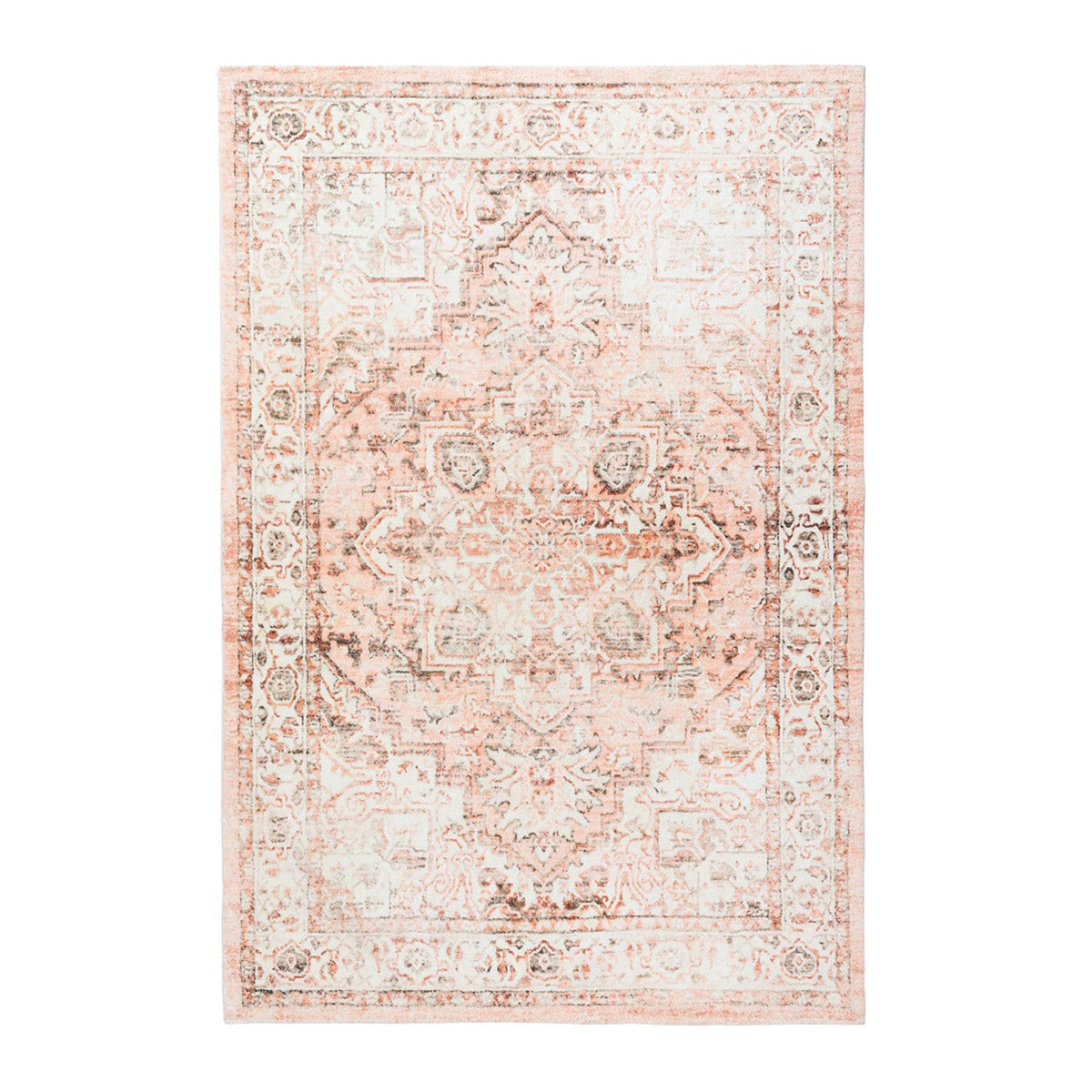 The Veronique Distressed Washable Rug is a beautiful transitional washable and foldable rug featuring a traditional medallion design. With a stunning palette of peach and cream tones with subtle brown details, it is a bordered vintage distressed style rug with elaborate motifs and patterns. The beautiful design is printed on top of the fibres giving it a faded effect with a subtle vintage look. Veronique is woven in China using modern looming techniques and is constructed from a plush 8mm pile of ultra soft polyester fibres.