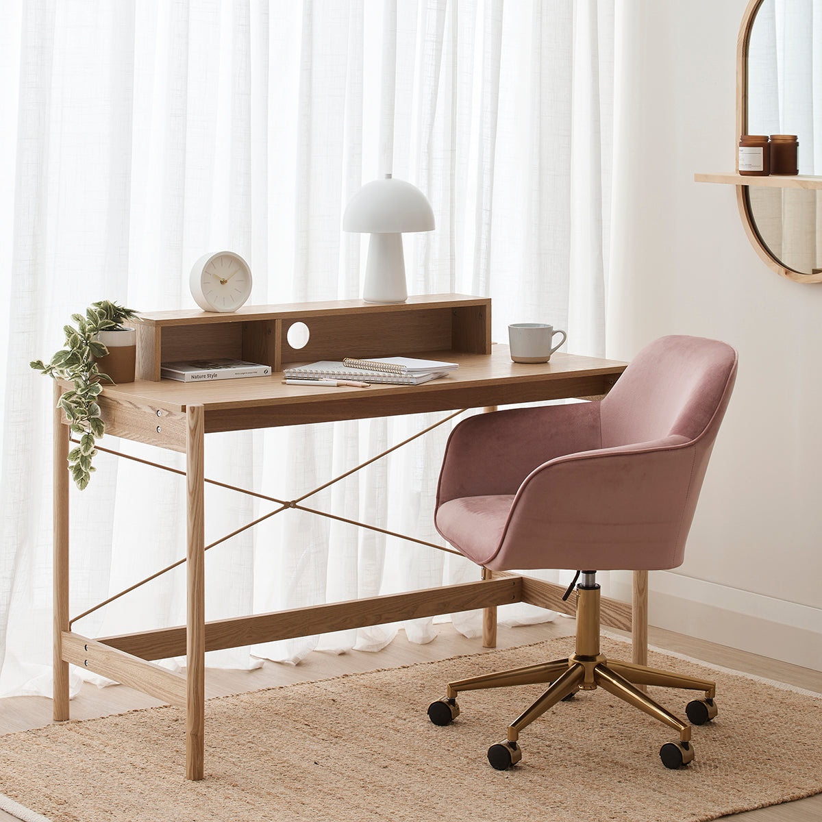 The Ava Velvet Office Chair presents a blend of comfort and style, featuring a bucket-style seat that will keep you comfortable throughout your work day. With a swivel function and adjustable height, this chair is equally as functional as it is stylish. The sumptuous velvet seat design sits atop a metal base to create the perfect contemporary form ideal to elevate any home office.
