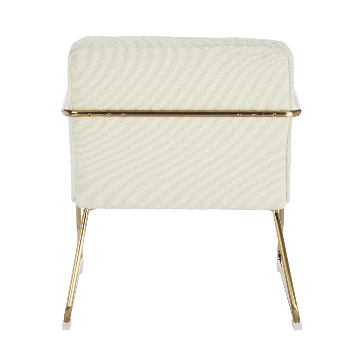 Experience the fusion of contemporary design and tactility with the Felix Boucle Armchair. This chair showcases a slender form with a sleek gold metal frame and a textured boucle upholstered seat. The panelled design of the padded seat offers a subtle element of visual interest, whilst the simple armrests add to its overall comfort. With a unique contrast of materials, this chair will make for a striking addition to any living space or bedroom.
