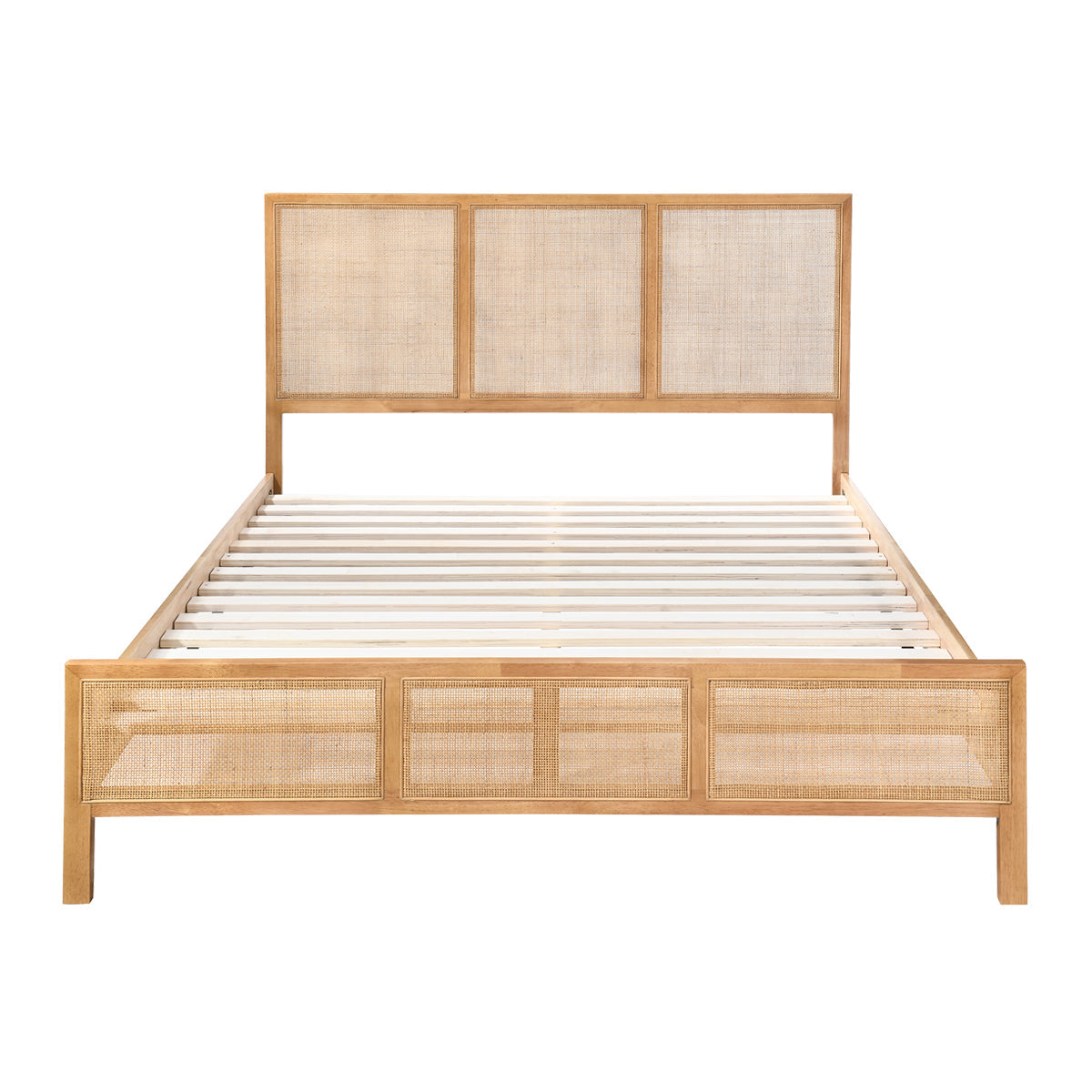 Elevate your bedroom with the Kayla Rattan Queen Bed, showcasing a sophisticated design rich with warmth and texture. This bed is elegantly detailed with intricate rattan panels to exude a contemporary aesthetic with a touch of retro charm. Its angular lines and natural tones will effortlessly complement any existing interior style and colour scheme in your sleep sanctuary.