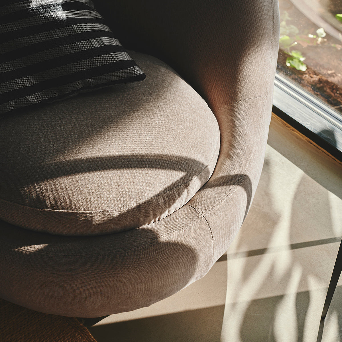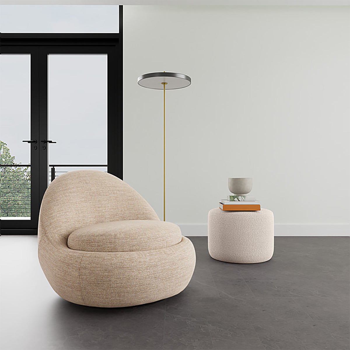 The Babette Fabric Swivel Armchair offers an understated contemporary style, with a plump, soft cushioned seat and supportive backrest. The chair features a simple curved silhouette with a discreet swivel foot for added functionality. It is upholstered in a soft fabric woven from a polyester blend, which is incredibly durable, fade-resistant and easy to maintain. This chair will add dimension and elegance into any living room interiors with its minimal curved form and chic aesthetic.