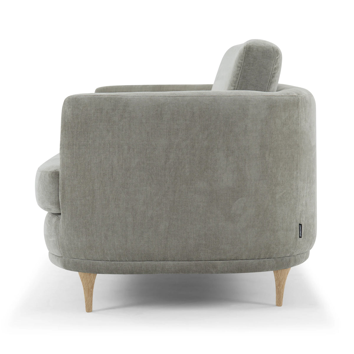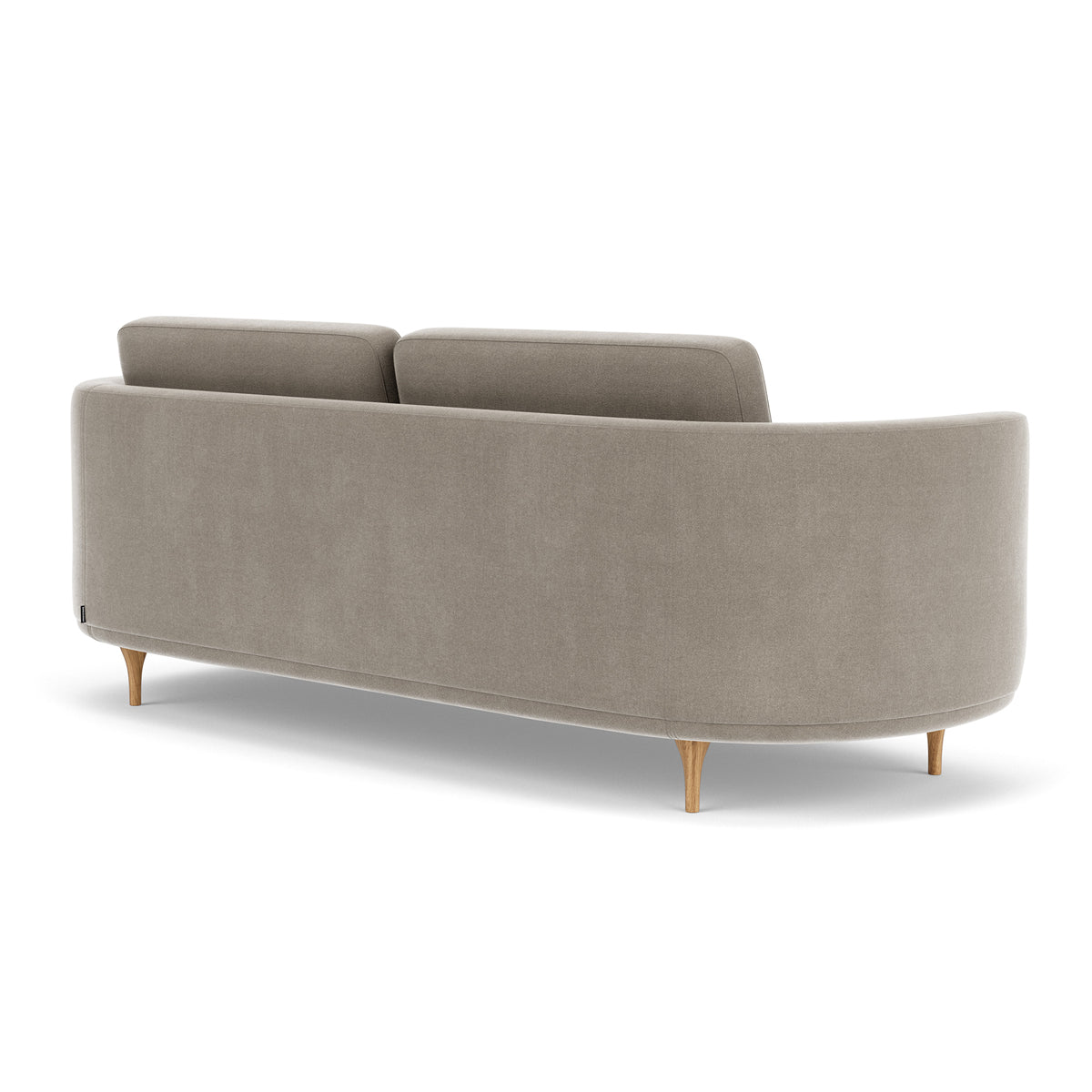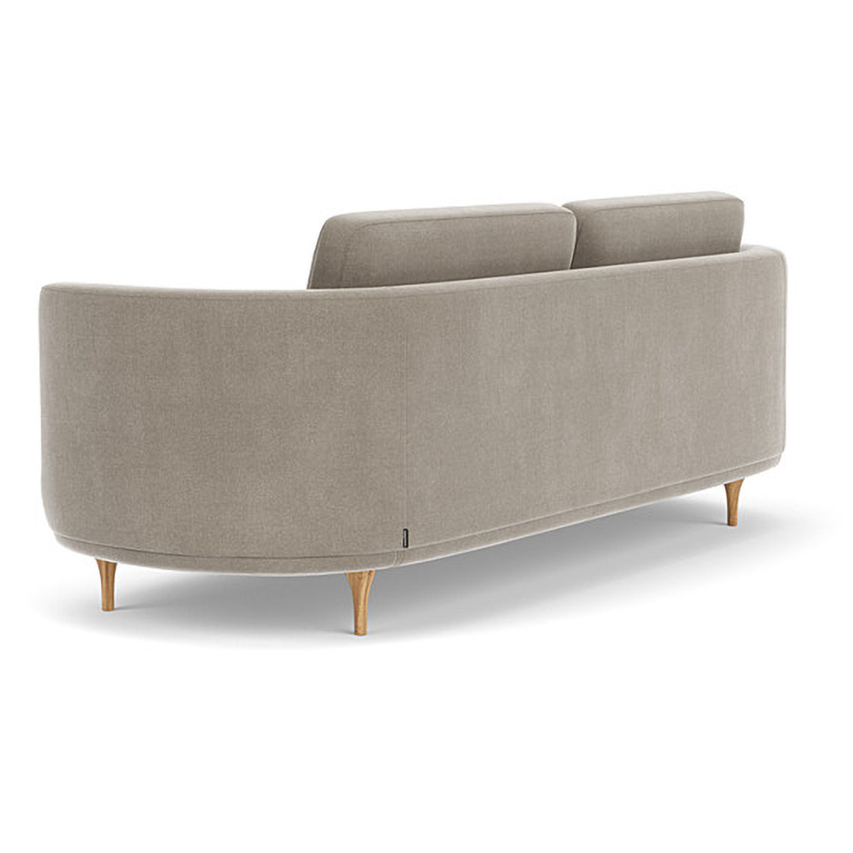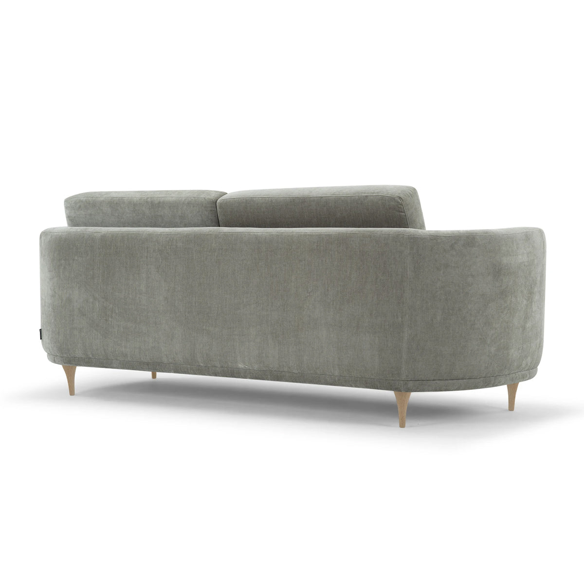 Elinor is a curved 3 seater fabric sofa with a soft, retro look. It embraces and invites relaxation and tranquility, and at the same time adds a feminine elegance to your living room. The elegant, slender wooden legs complete the design and at the same time create a fine contrast between the voluminous back and the slender legs.