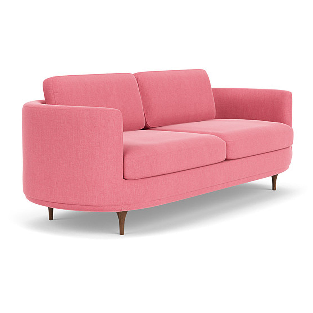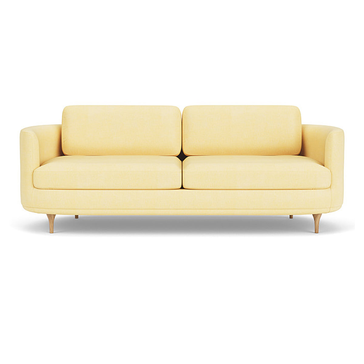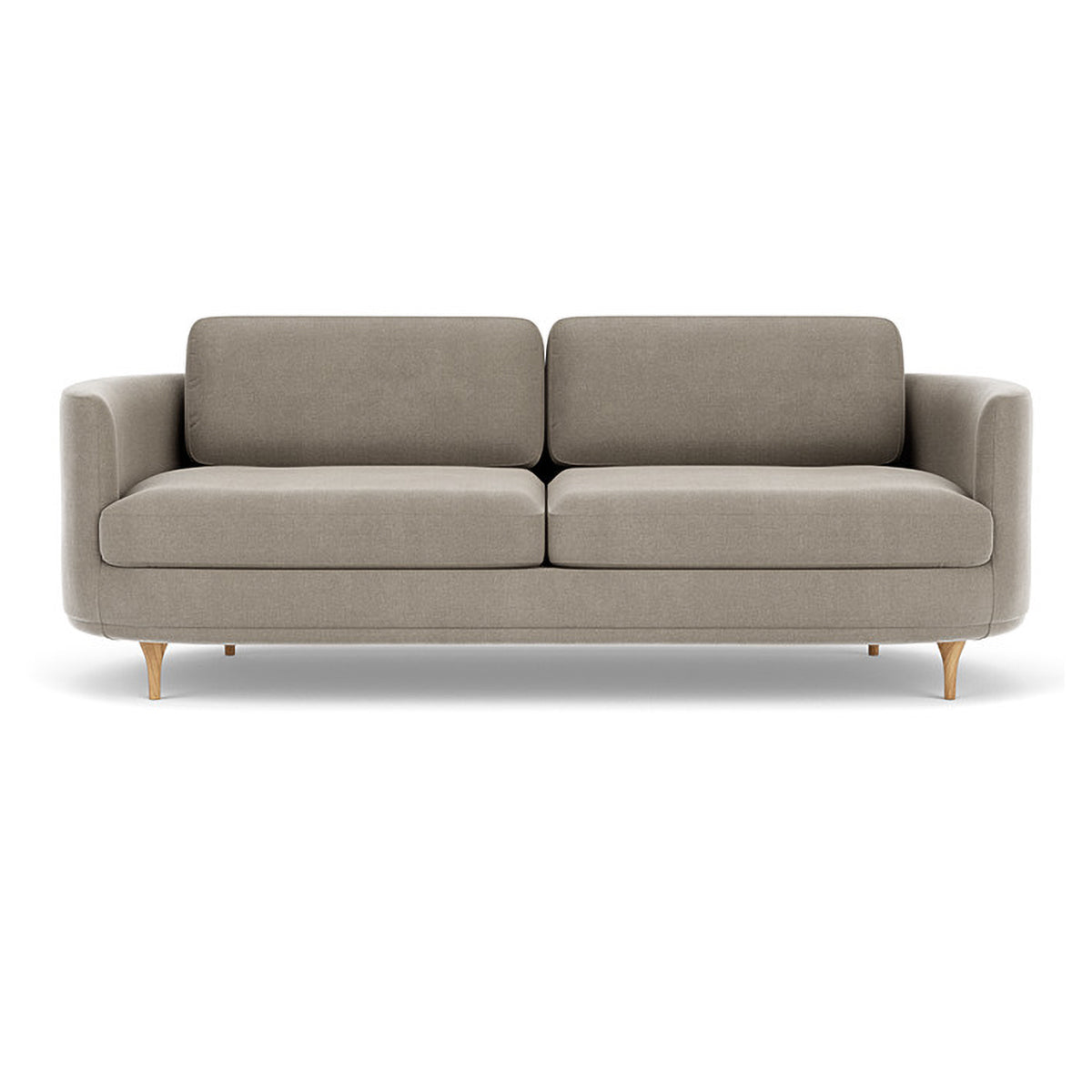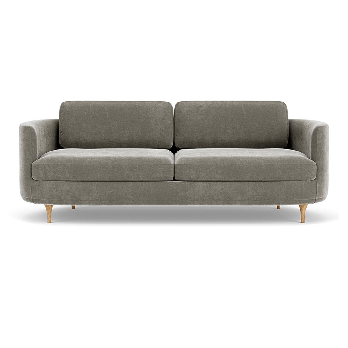 Elinor is a curved 3 seater fabric sofa with a soft, retro look. It embraces and invites relaxation and tranquility, and at the same time adds a feminine elegance to your living room. The elegant, slender wooden legs complete the design and at the same time create a fine contrast between the voluminous back and the slender legs.