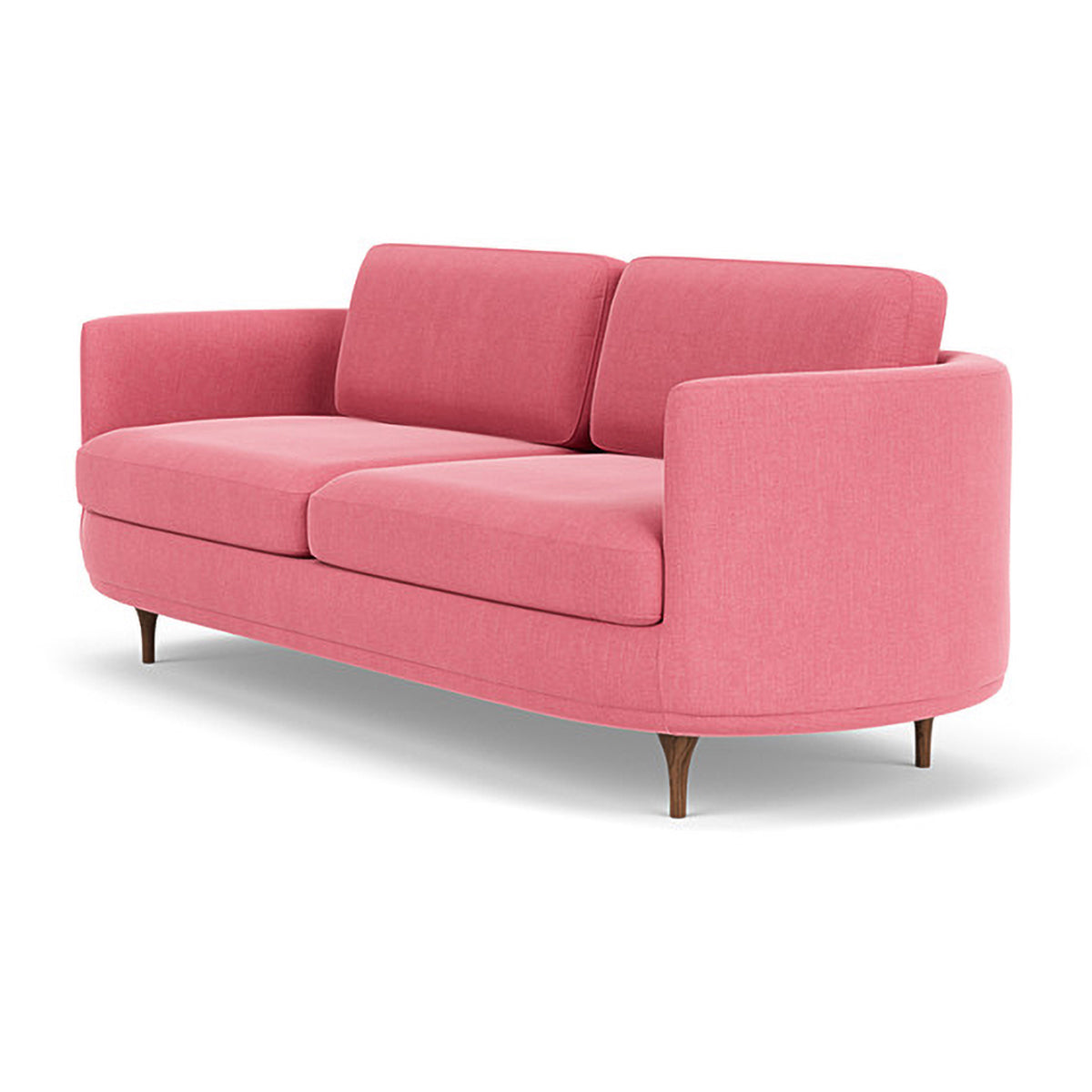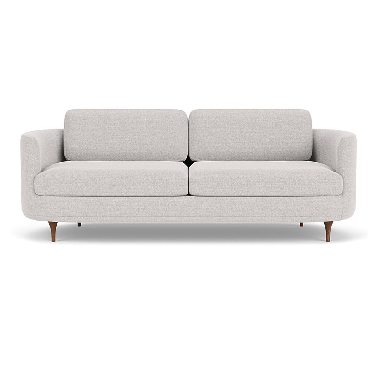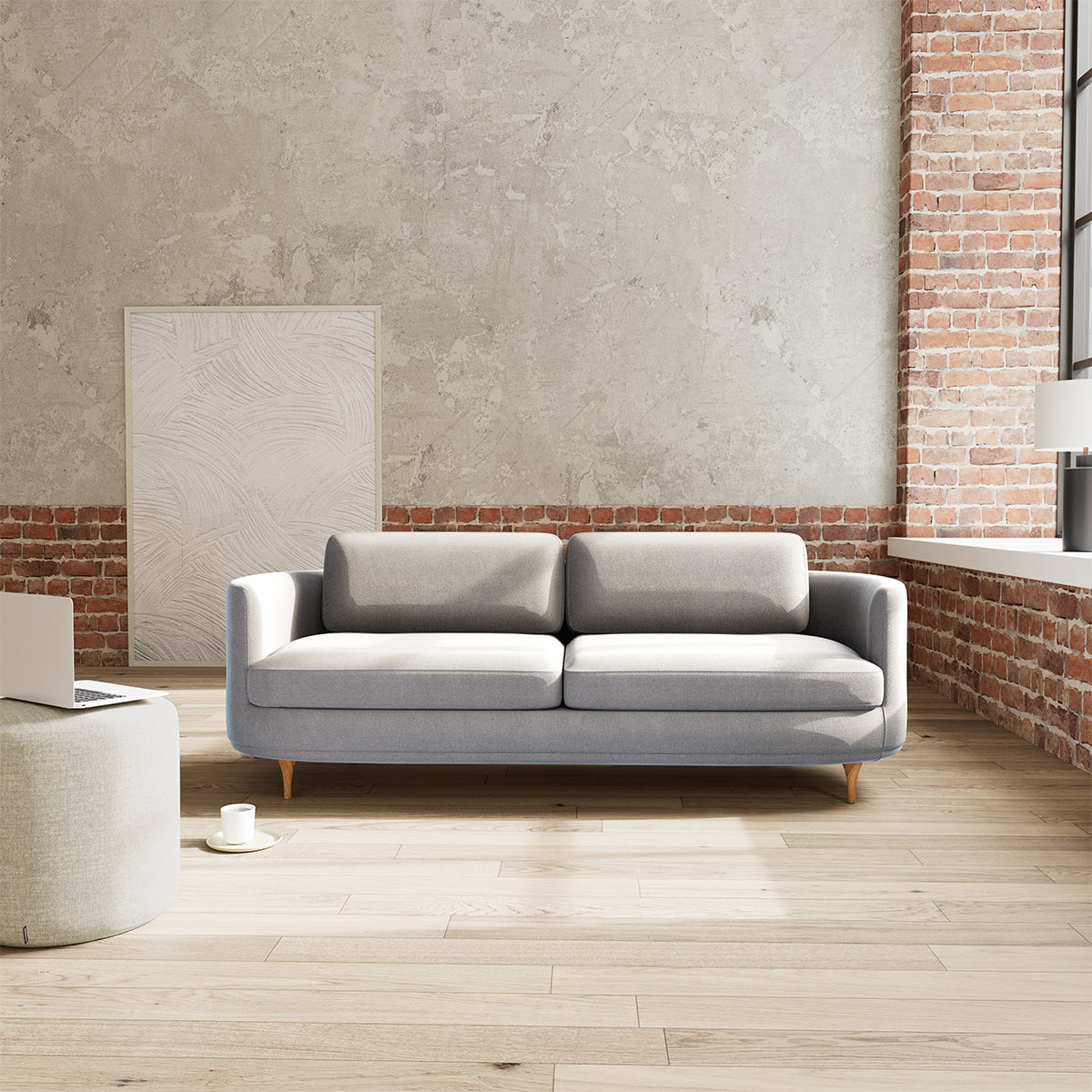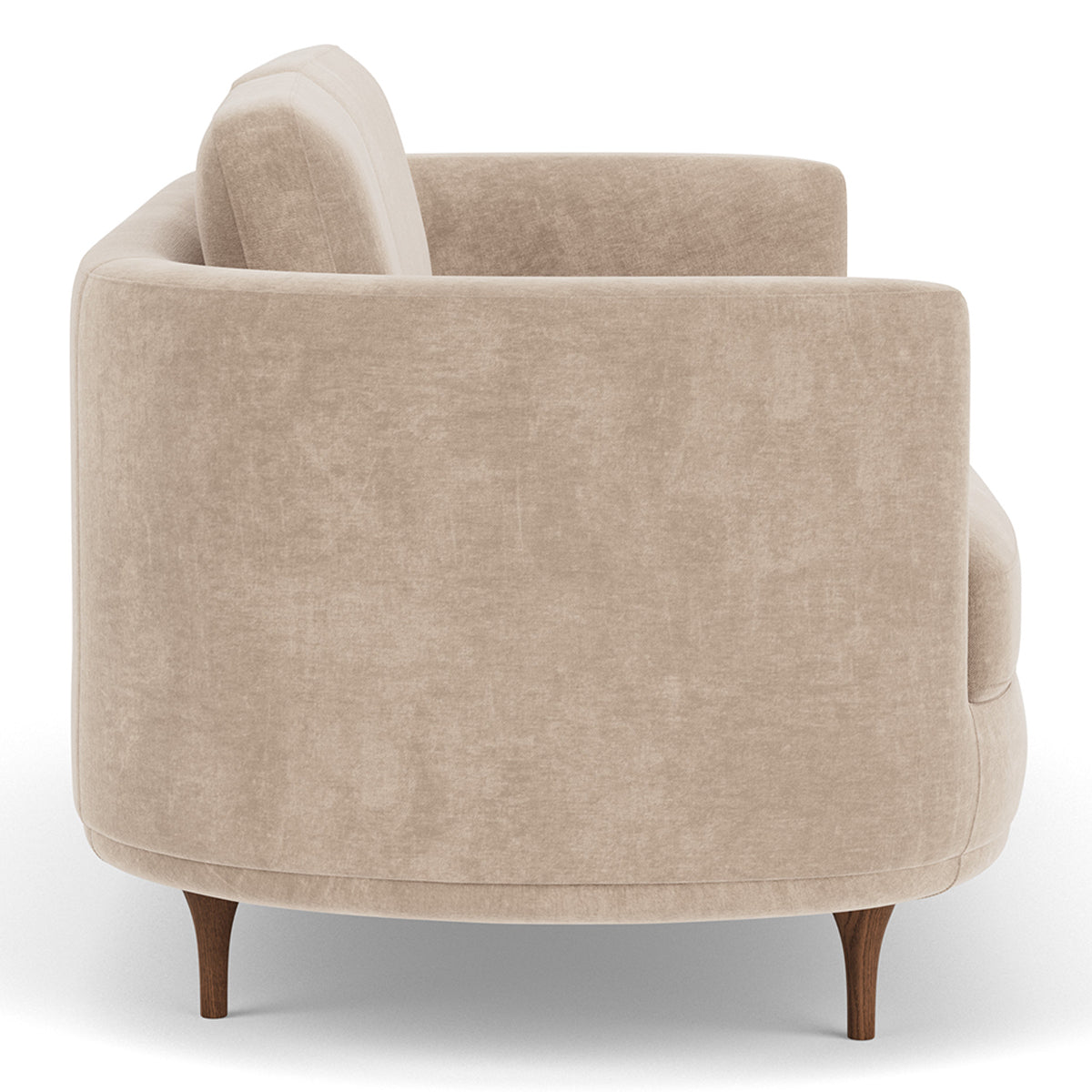 Elinor is a curved 3 seater fabric sofa with a soft, retro look. It embraces and invites relaxation and tranquility, and at the same time adds a feminine elegance to your living room. The elegant, slender wooden legs complete the design and at the same time create a fine contrast between the voluminous back and the slender legs.