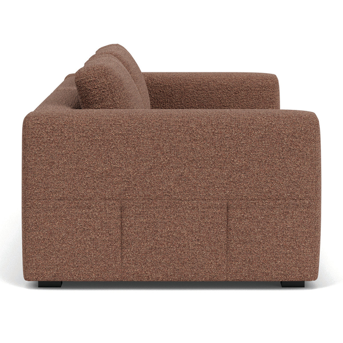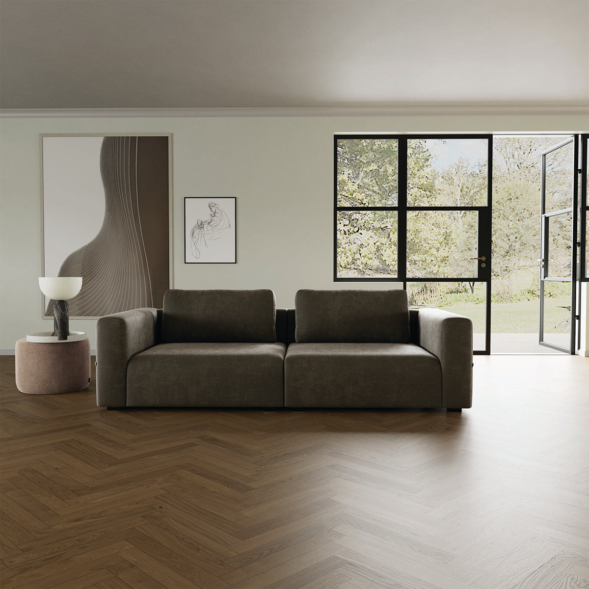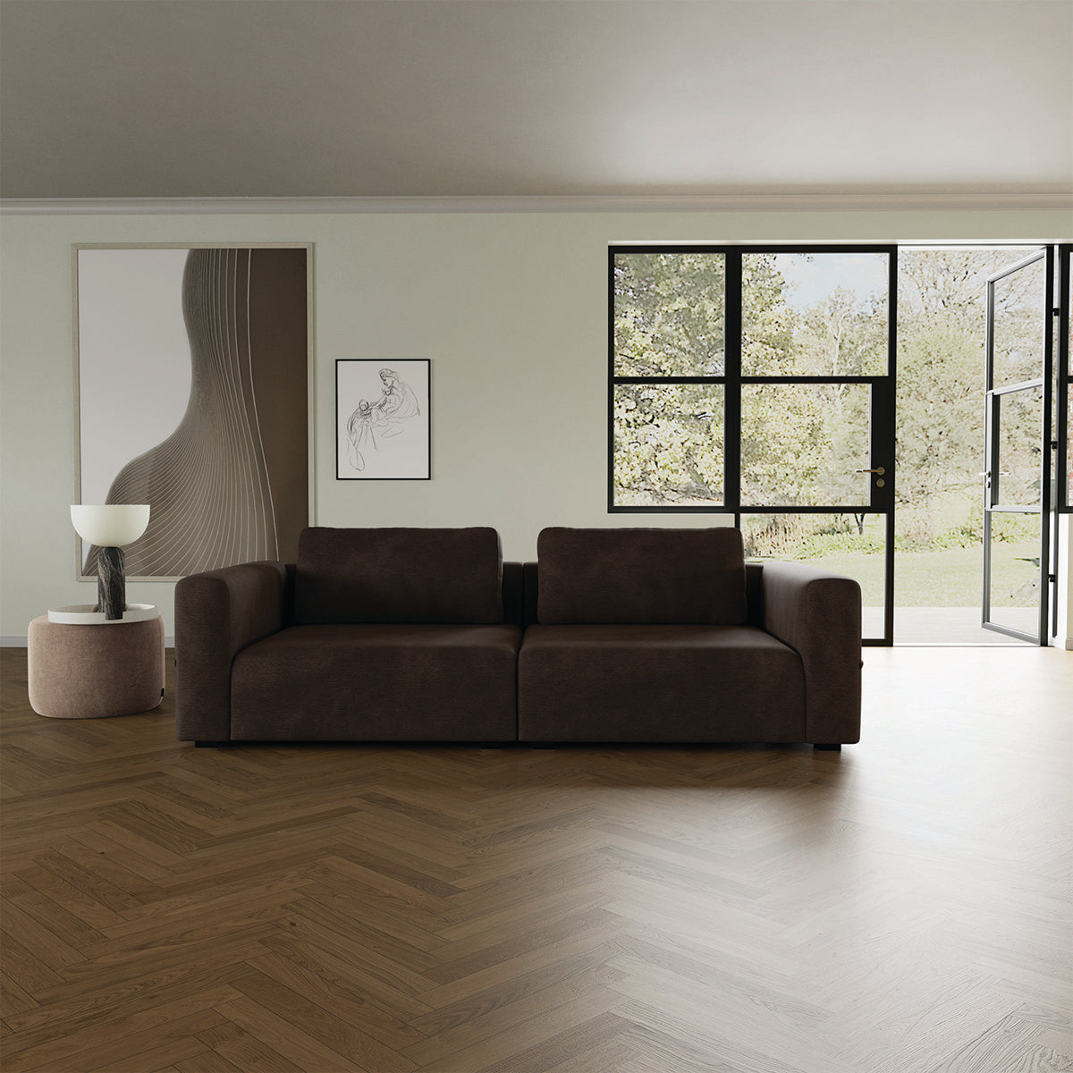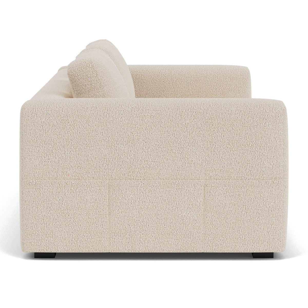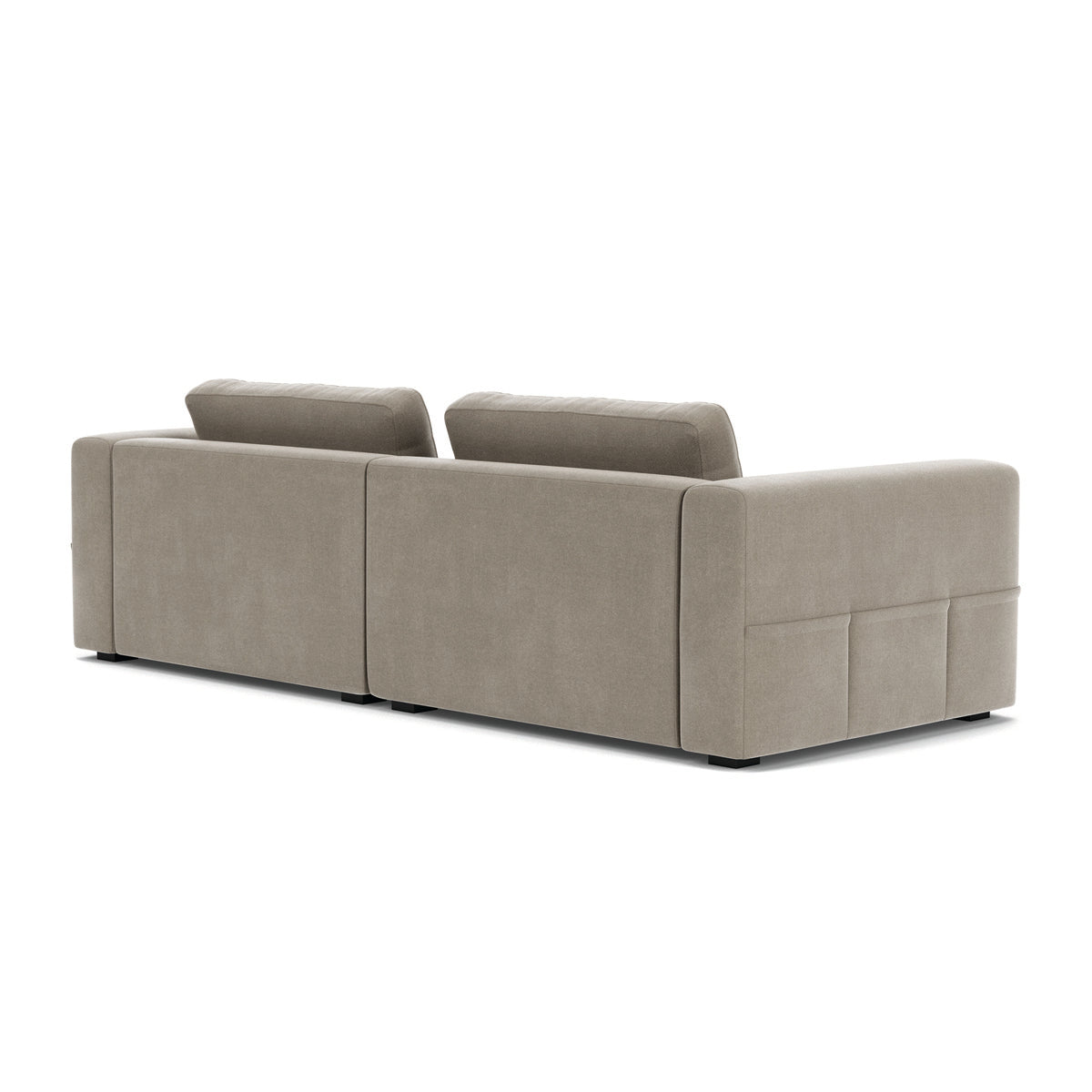 Designed for both style and function, the Riley Sofa makes a modern statement with its deep seat, boxy silhouette, and oversized cushions. Upholstered in a soft fabric, it balances clean lines with plush comfort. Functional side pockets add a practical touch, ideal for storing magazines or remotes while subtly enhancing its structured form. Rileys relaxed proportions and sink-in comfort make it an easy choice for everyday lounging.