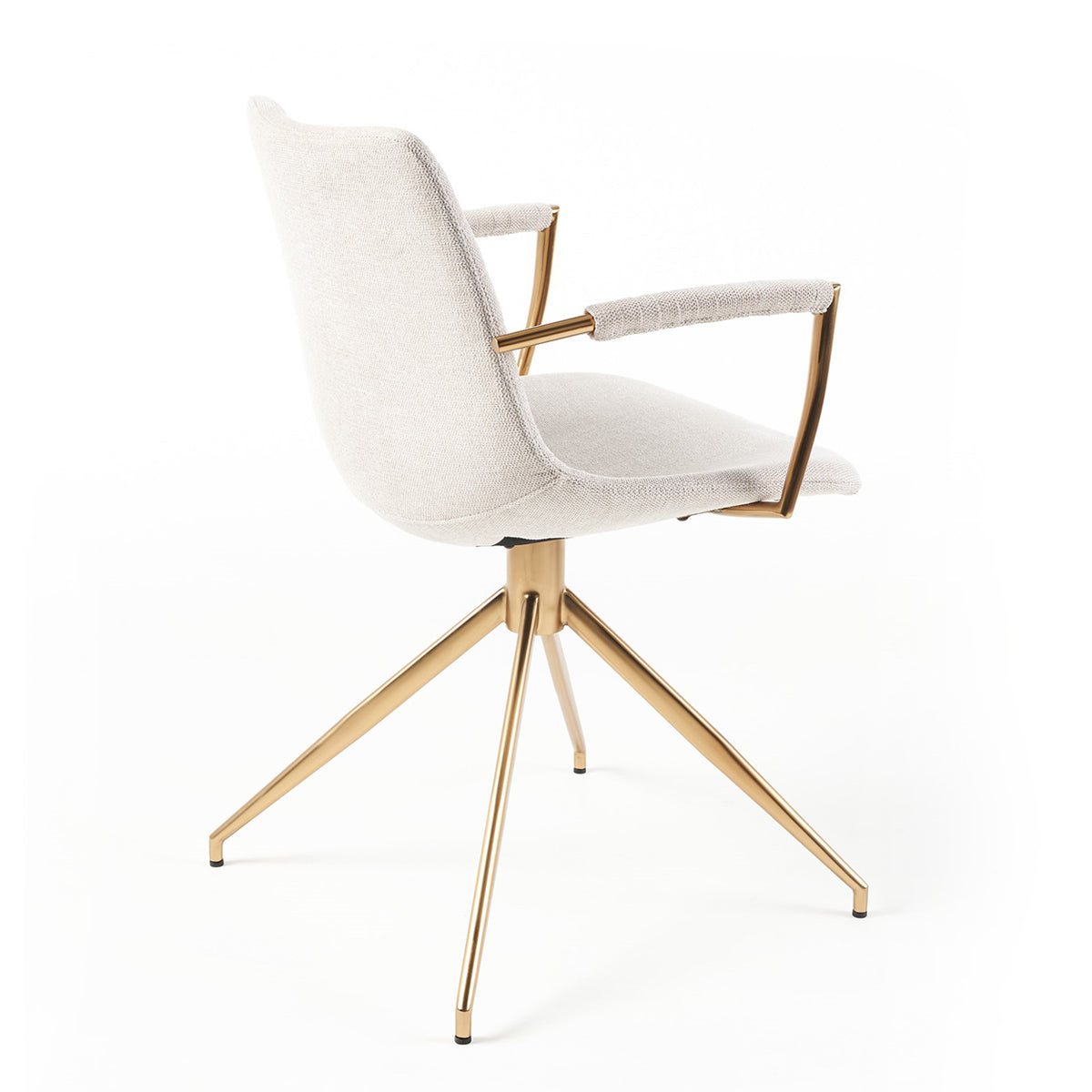 The Belair Fabric Dining Chair is an all-class piece that is sure to be the centre of attention in any space with its glamorous aesthetic. This chair features a polished gold frame with a swivel function that offers a combination of elegance and practicality. The upholstered seat and armrests ensure extra comfort whilst adding to its stylish and cohesive look. The Belair is a versatile piece to elevate any dining setting, home office, or bedroom.