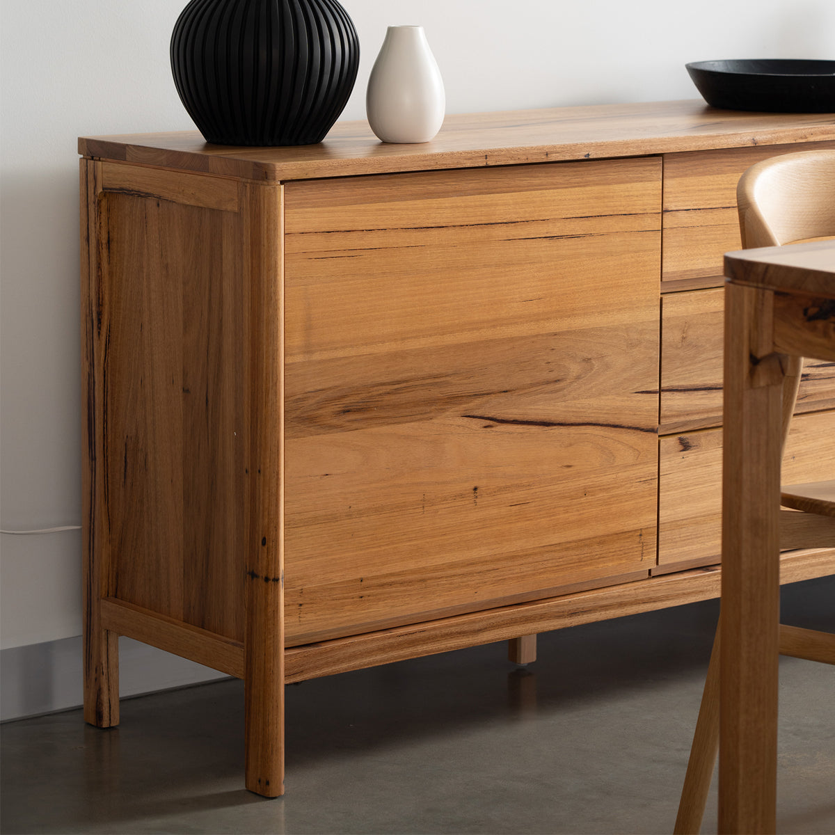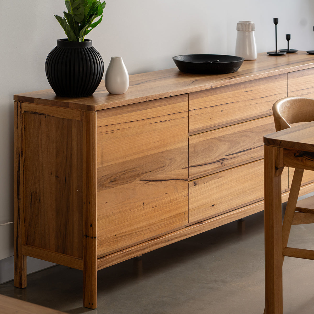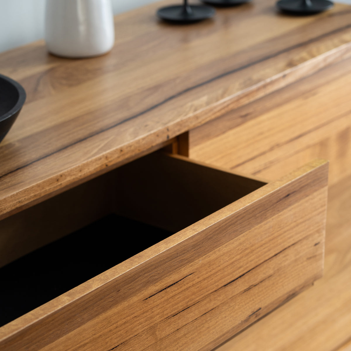 The Emilia Buffet is part of the broader Emilia dining range, a contemporary and elegant homage to craftmanship and fine detailing. The solid messmate timber and soft edges celebrate the natural beauty of the material. It features two soft close doors and three felt lined drawers to neatly house all your serving ware and dining essentials. This buffet will effortlessly elevate any dining space and introduce an element of functionality with its storage possibilities.