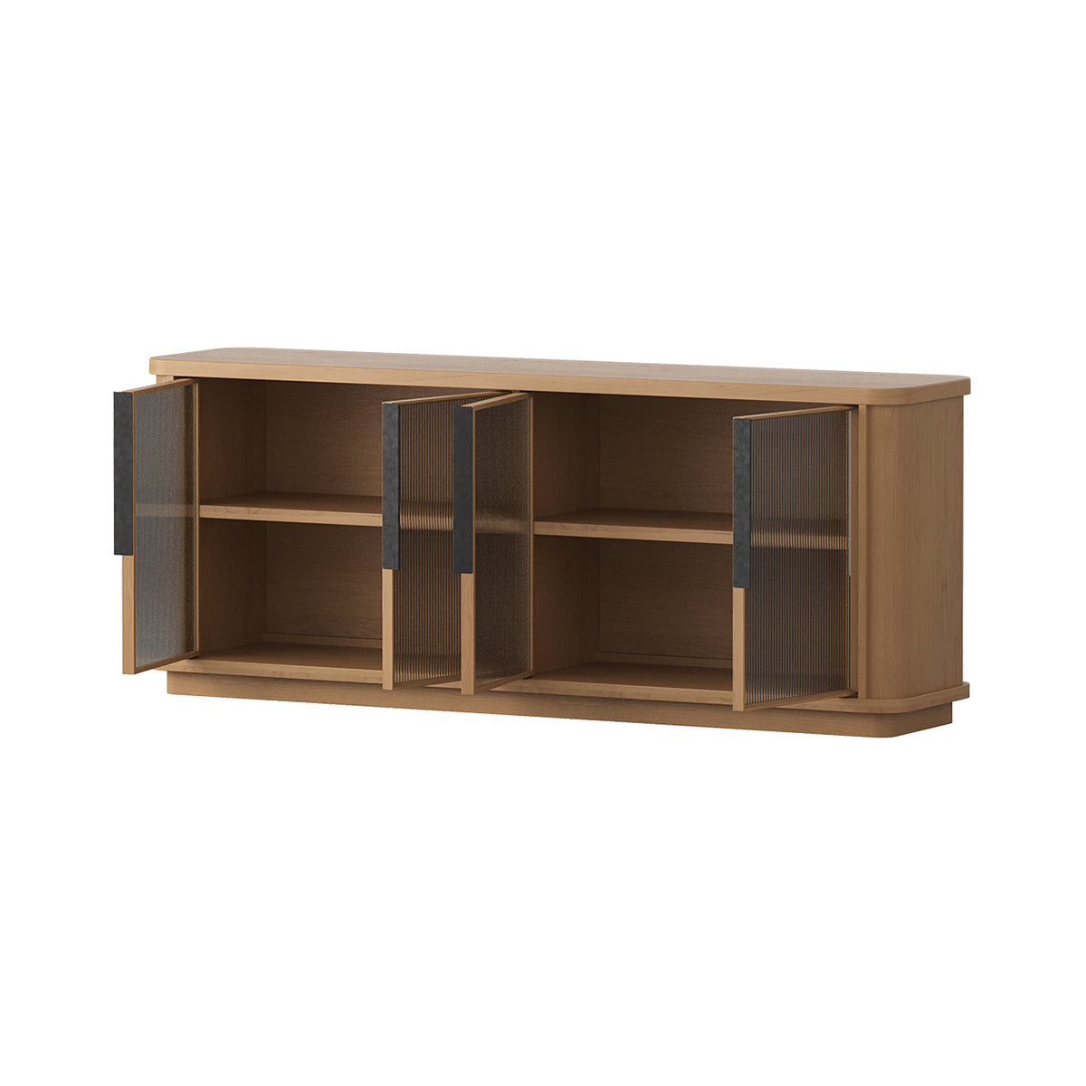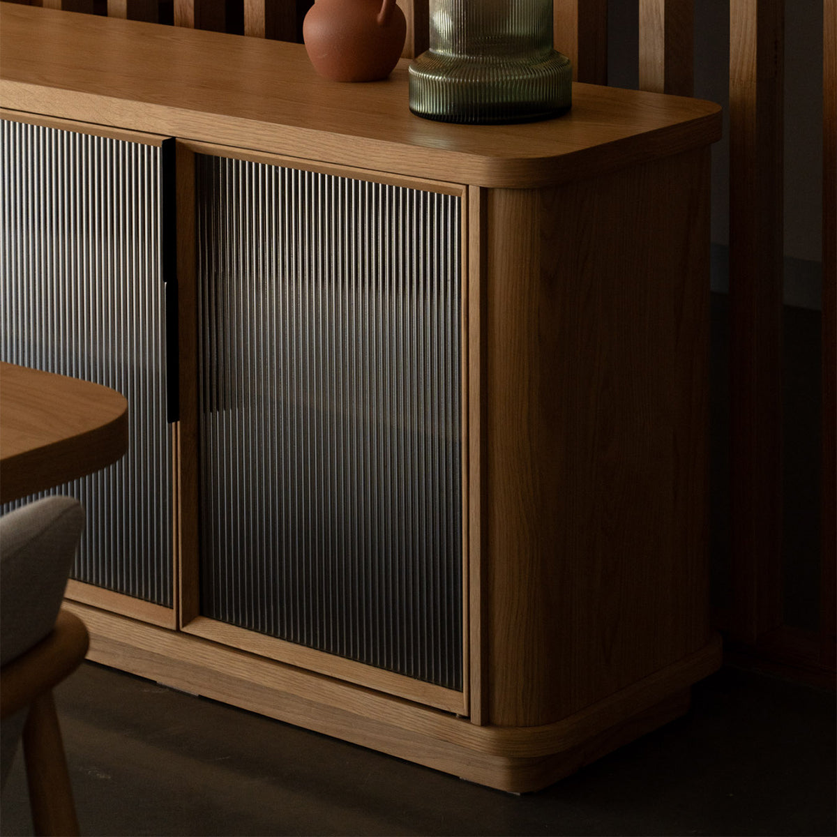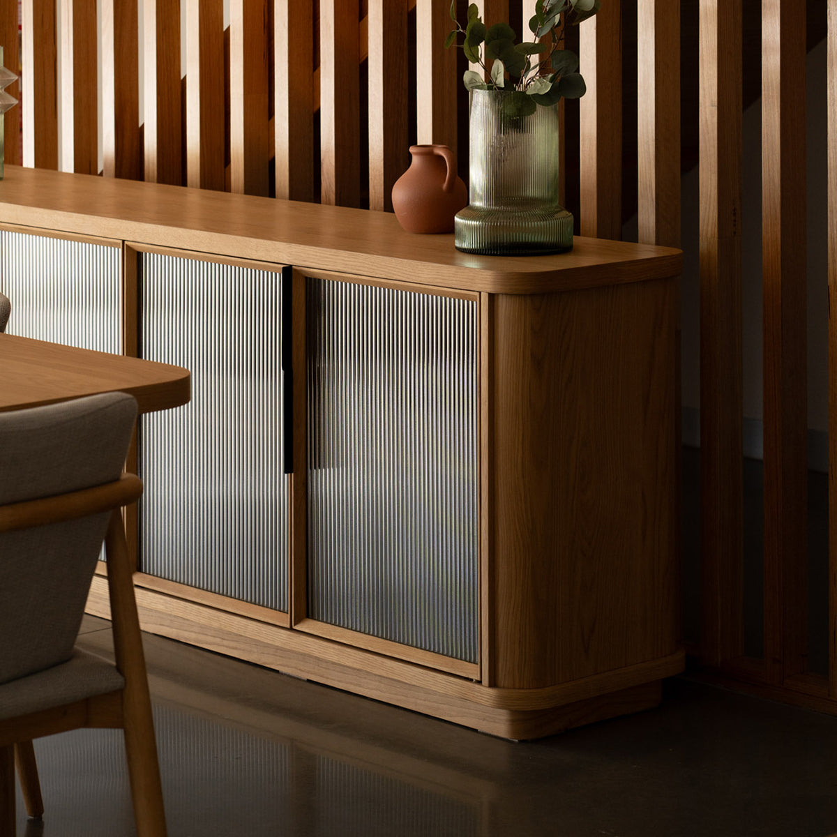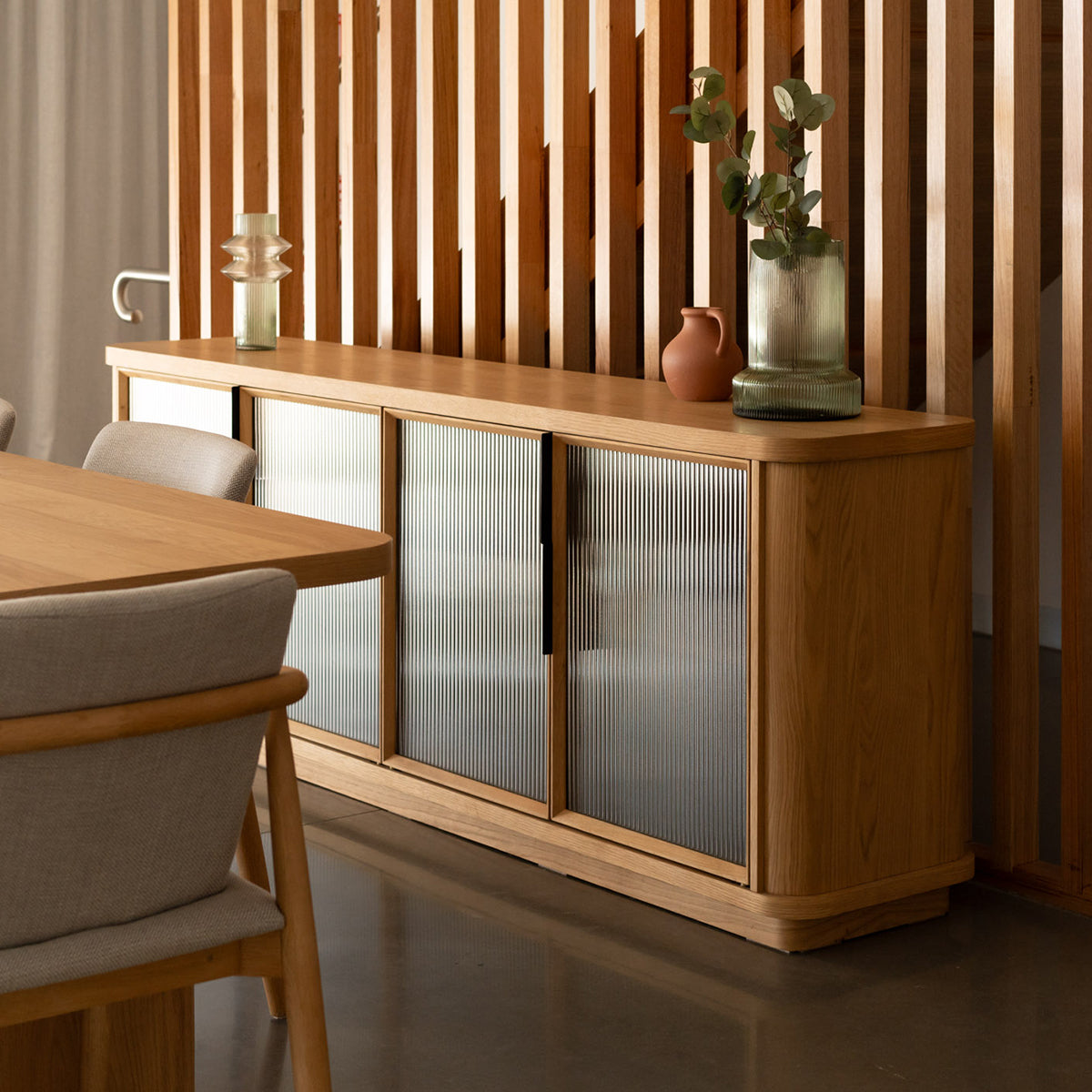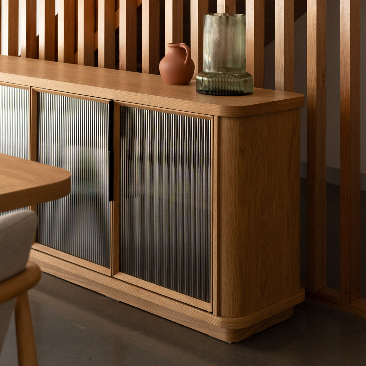 The Weston Buffet is part of the broader Weston dining collection, a range that exudes quality craftsmanship and modern design. Crafted from high-quality oak material, this buffet features an elegant design that boasts practicality with its generous storage space. Its refined details hero gently rounded corners and fluted glass door panels, elevating your tableware storage to new heights.