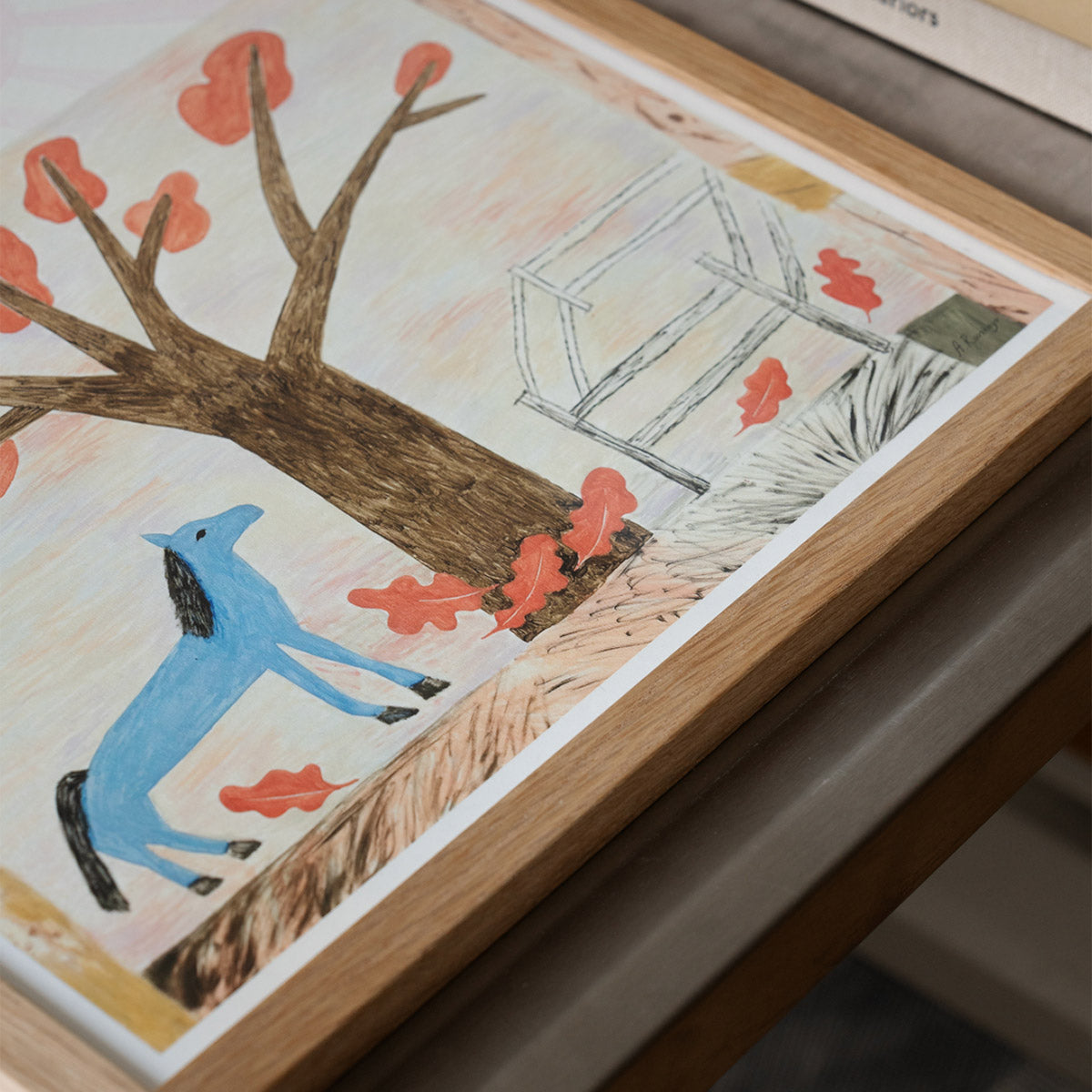A dreamlike composition, Blue Horse Art Print features a striking cobalt equine standing beneath a blossoming tree, bathed in the soft glow of a rising sun. Muted earth tones meet painterly textures, creating a whimsical yet serene landscape. The hand-rendered details bring a sense of warmth and nostalgia, making this piece an enchanting addition to any art collection. Ideal for those drawn to folk-inspired aesthetics and playful storytelling through colour and form.