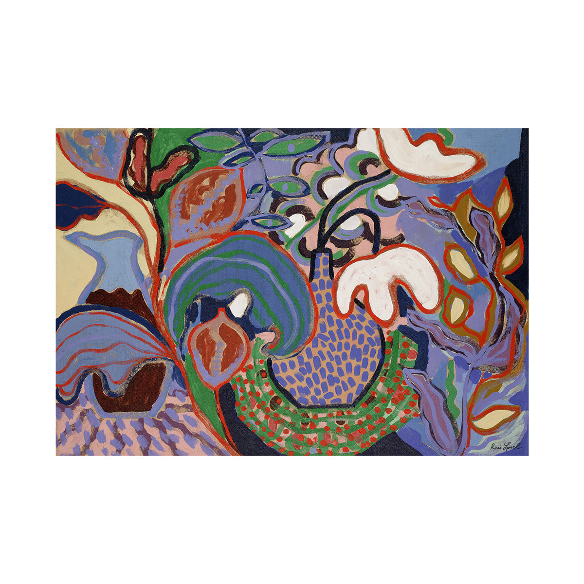 The Felicity Art Print bursts with energy through its vivid colours and abstract forms, evoking a sense of organic beauty. Rich in vibrant greens, purples, and reds, the composition draws attention to its layered shapes and bold lines, creating a dynamic interplay of patterns. Perfect for adding life to any space, this piece brings a touch of modern art while retaining a playful, earthy charm. A stunning statement for those who appreciate bold, expressive design.