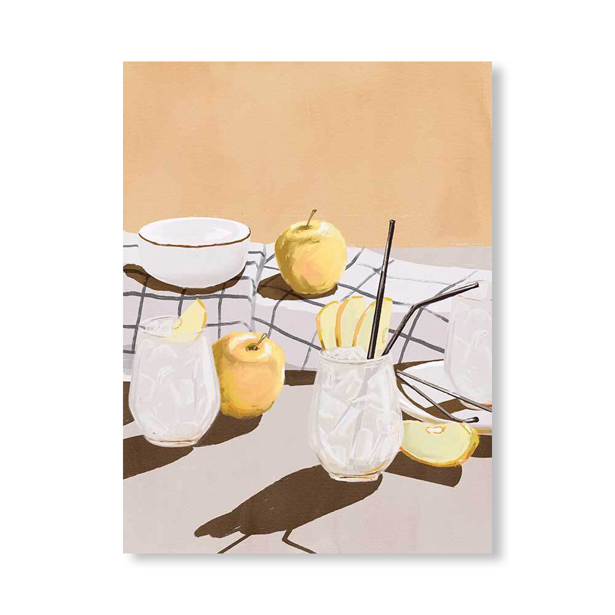 Apple Juice Art Print - Quench that summer thirst with a cold glass of freshly squeezed apple juice. Bring some summer energy to your space with this gorgeous piece, capturing a moment in time on a busy outdoor dining table with fresh apples, a few tall drinks, and the favourite tablecloth lying underneath the morning sun. A colour palette of soft yellow, beige, white and grey complement any interior design style.