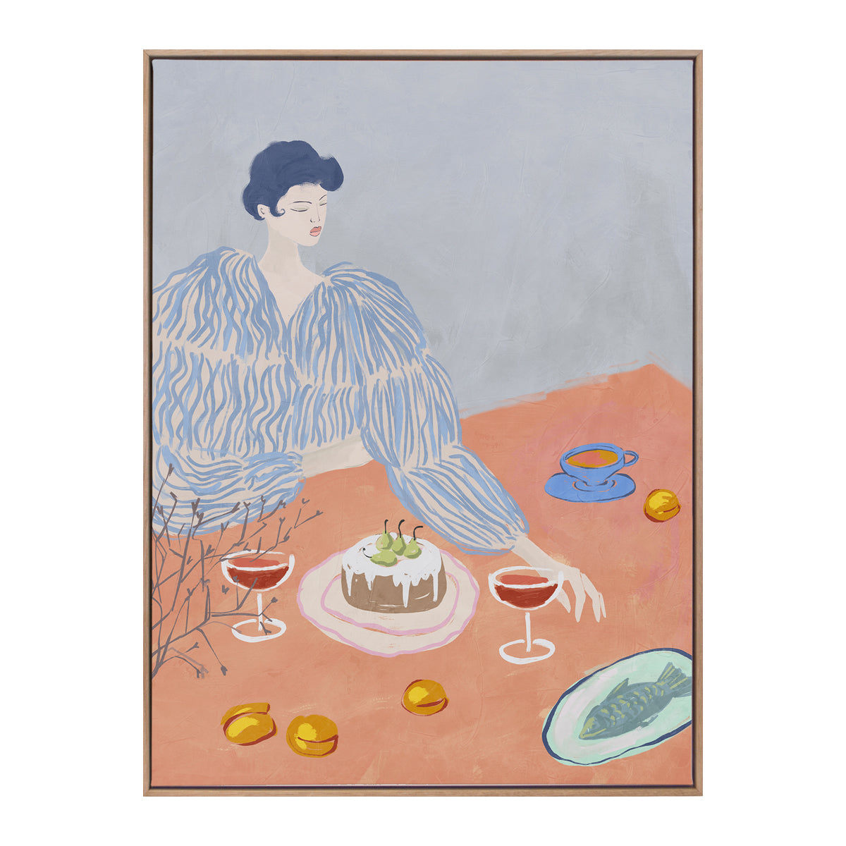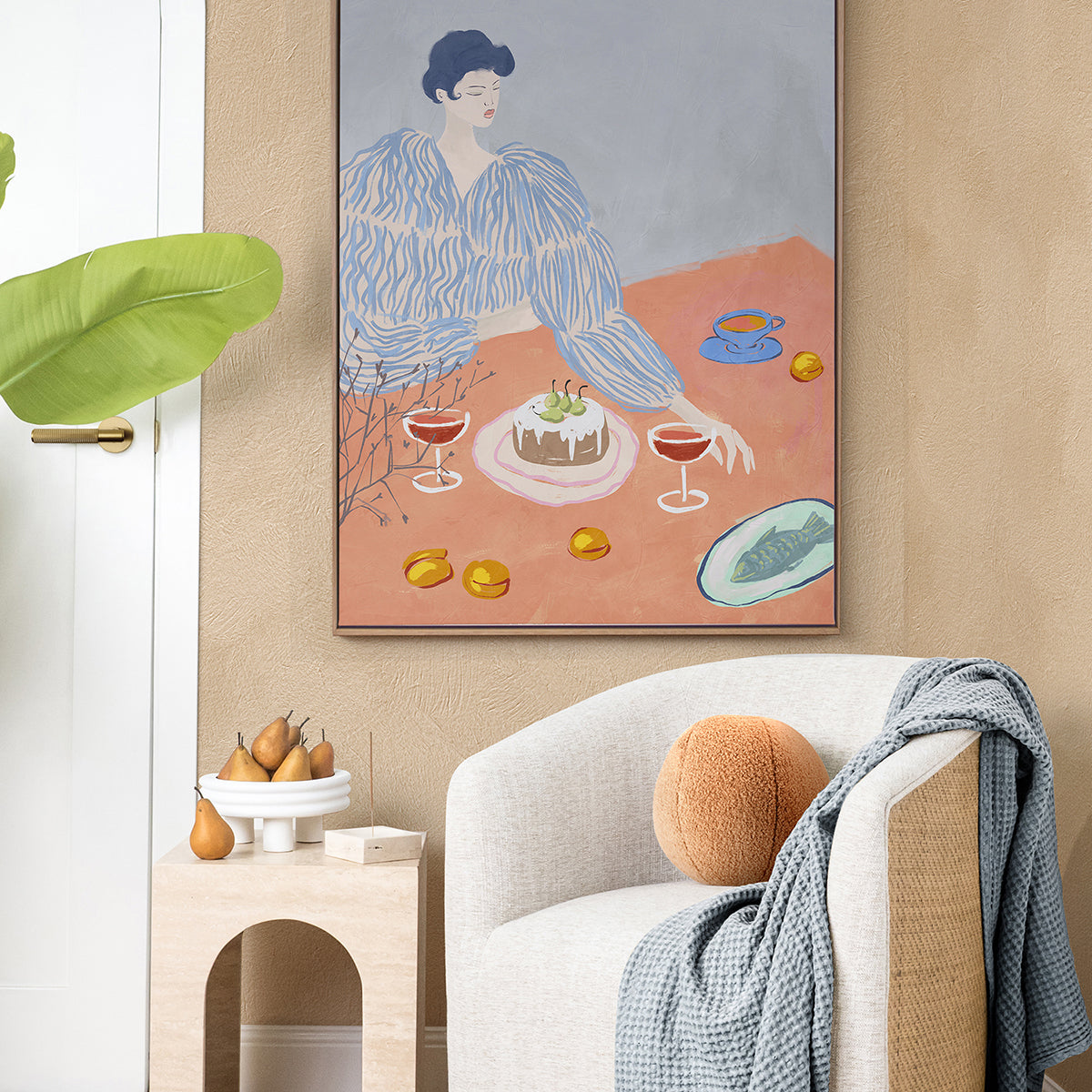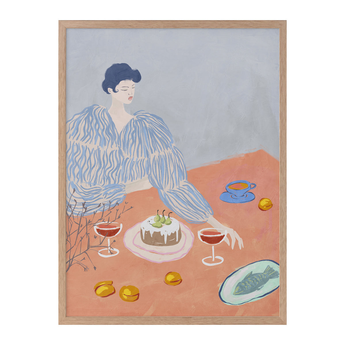 Transport yourself to the enchanting world of European elegance with the Camille Art Print. Set against the backdrop of contemporary European art styles, the piece invites you to join Camille in her sophisticated rendezvous of vin rouge and haute couture. Immerse yourself in the essence of European dining, in elegant attire, savouring delectable cuisine, and relishing in the company of good wine. This artwork exudes an inviting energy, while its complementary palette of blues and oranges adds a modern touch to any interior style.