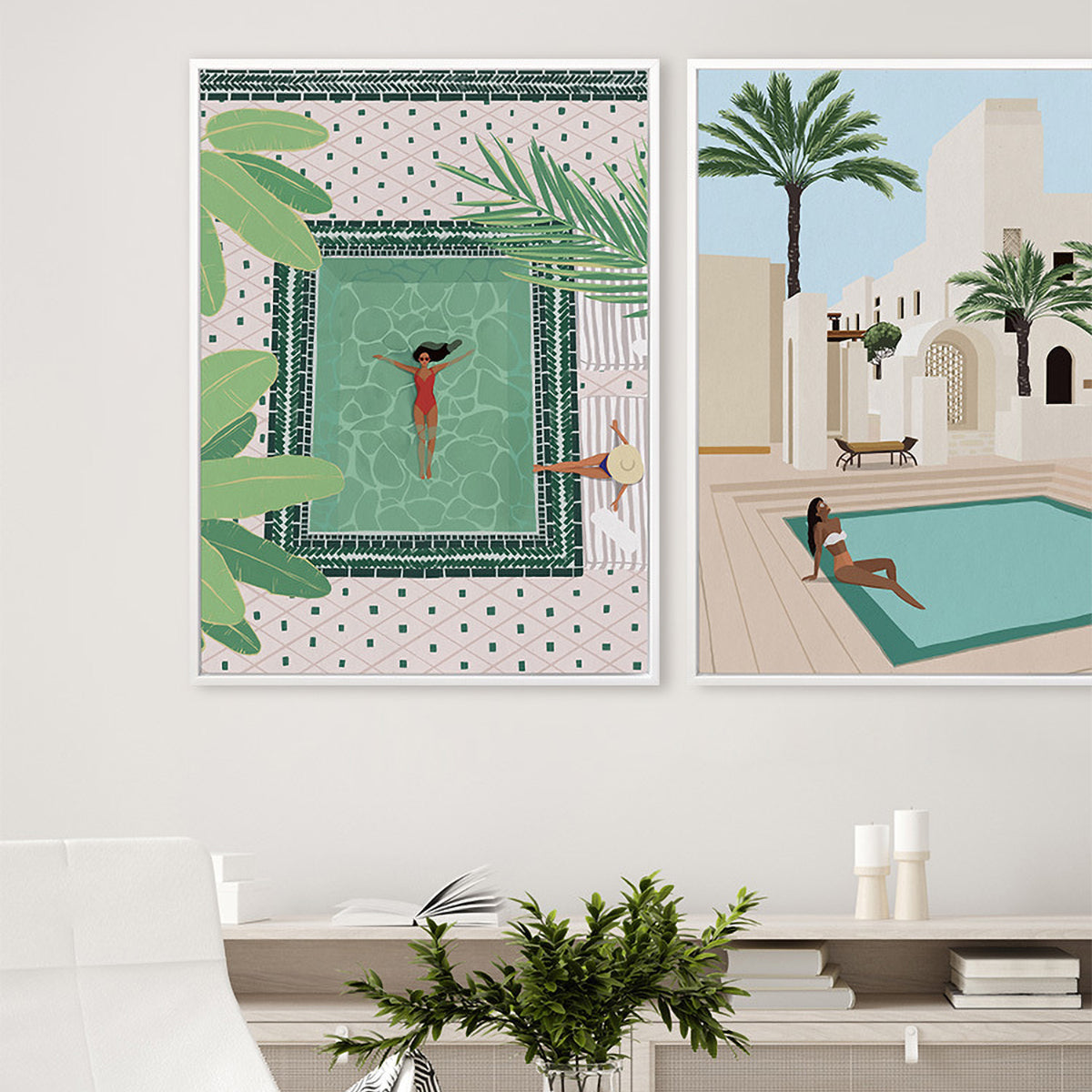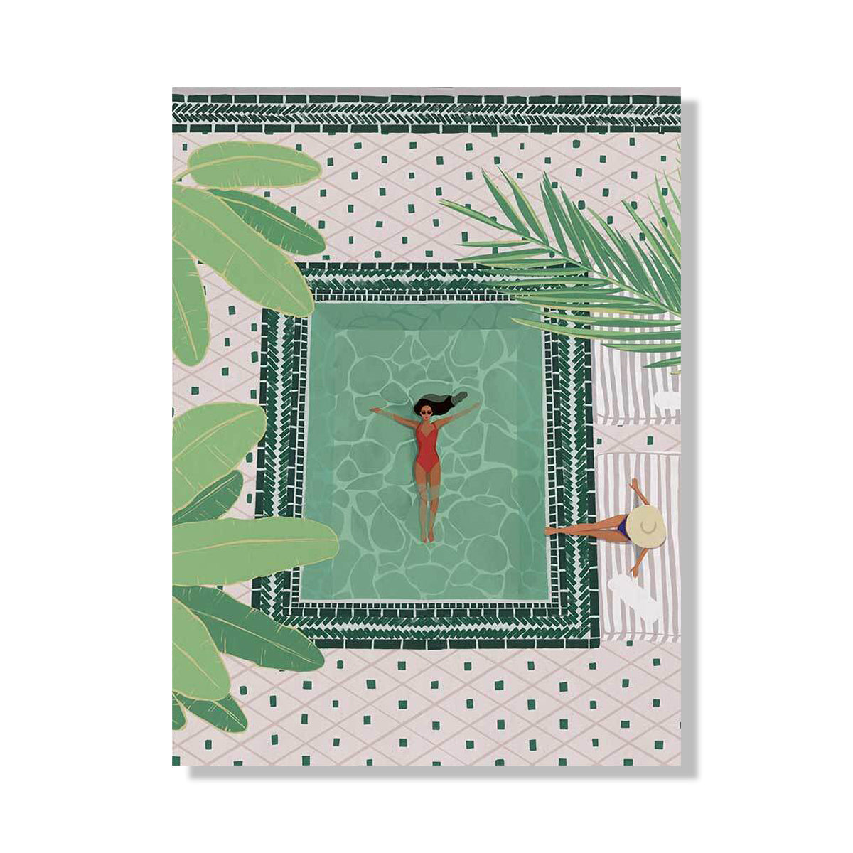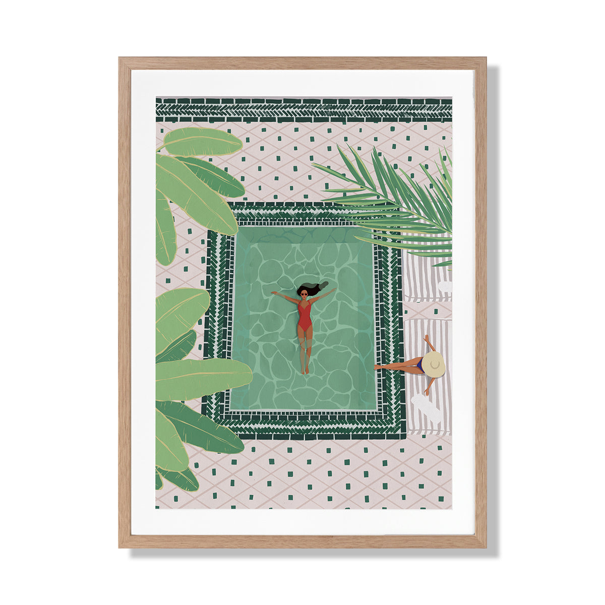 Carefree Callie Art Print - Bring the vacation vibes into your home all year long with this simple and playful illustrative piece. Featuring a sunkissed swimmer floating in a turquoise tiled pool and surrounded by greenery, the colour palette is fresh and light, with a light beige base and pops of turquoise, jade and seafoam green.